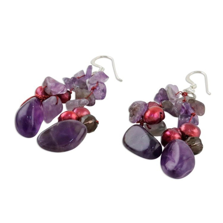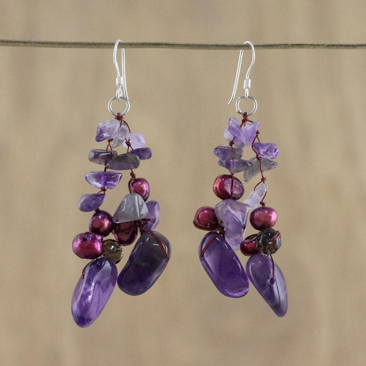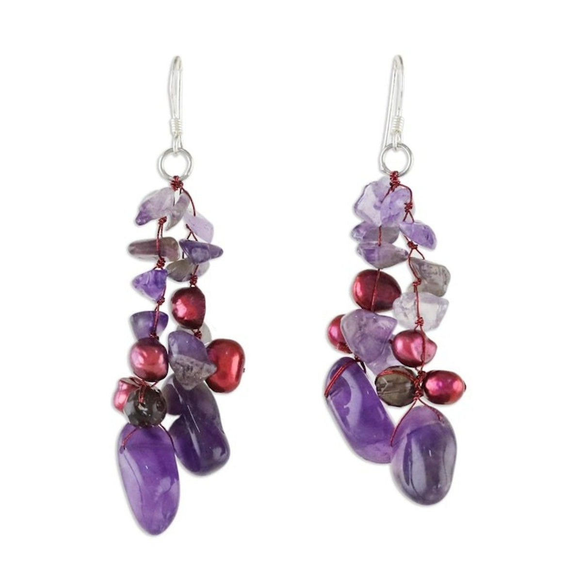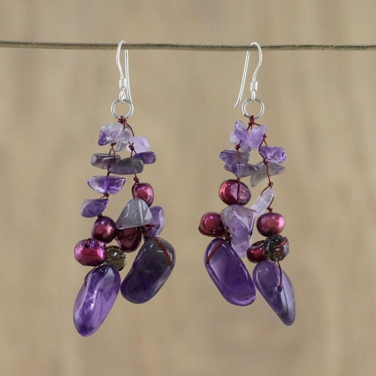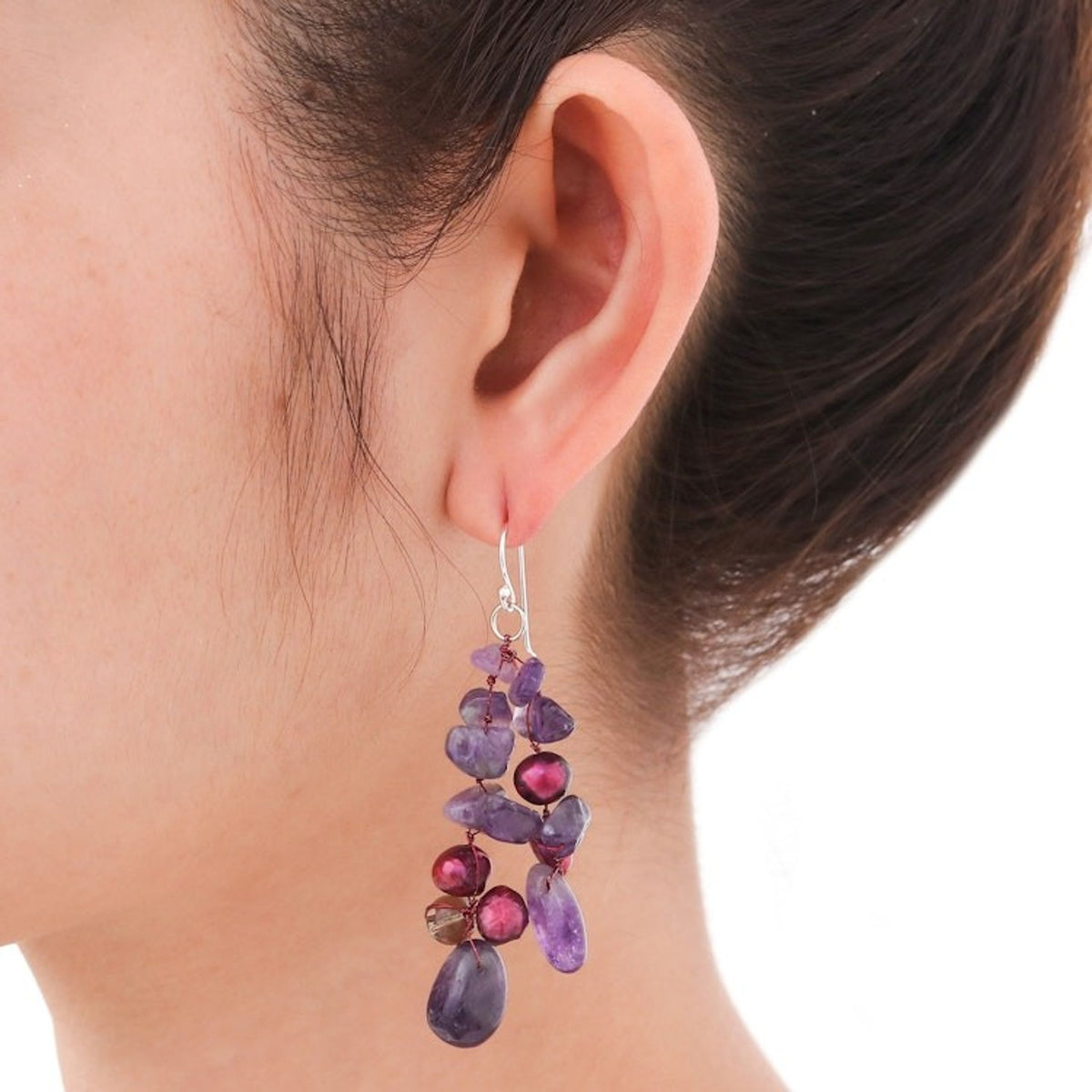 Handcrafted in Thailand, these earrings are made from sterling silver, freshwater pearl, amethyst, and glass on silk thread. They feature a matte finish, measure 3 inches L x 0.8 inches W, and secure with hook clasps. The natural variations in the stones should be expected.