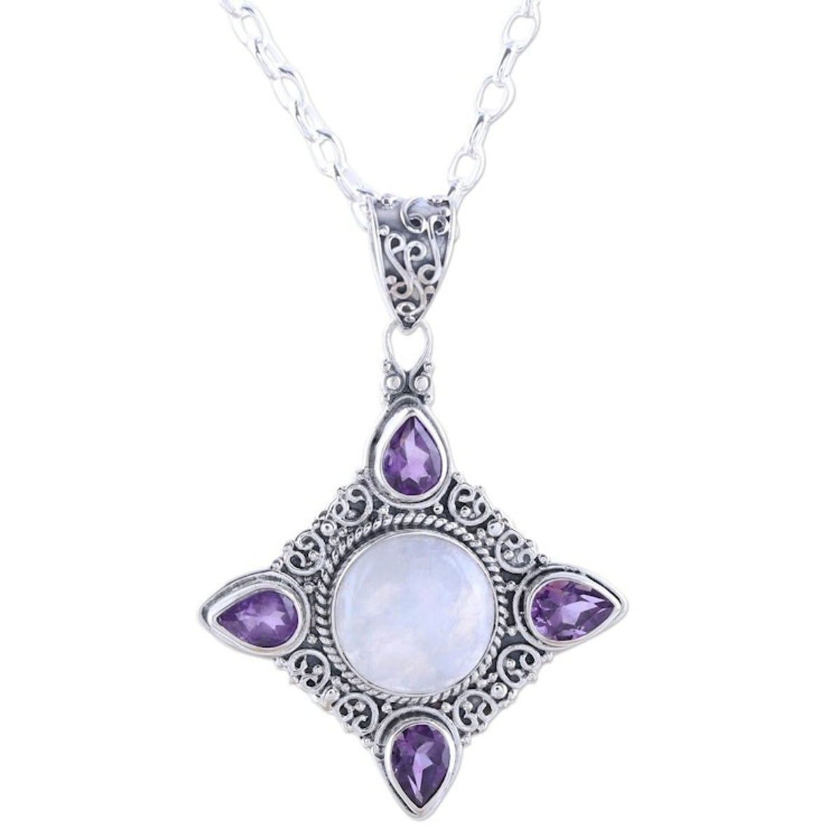 Handcrafted in India, this necklace is made from 925 sterling silver, rainbow moonstone, and amethyst. It features a combination finish and a spring ring clasp. The necklace is 18 inches L, with the pendant measuring 2 inches L x 1.4 inches W.