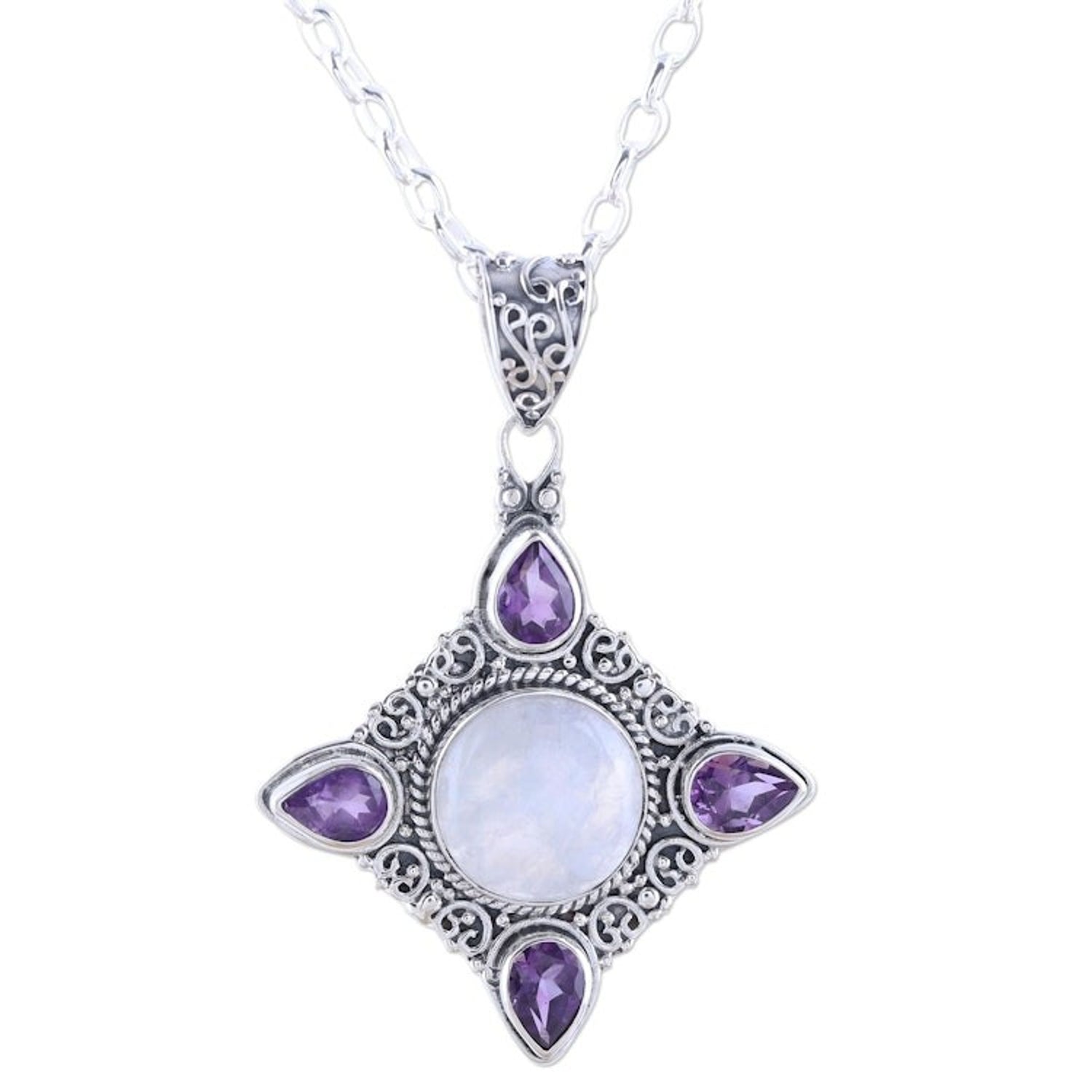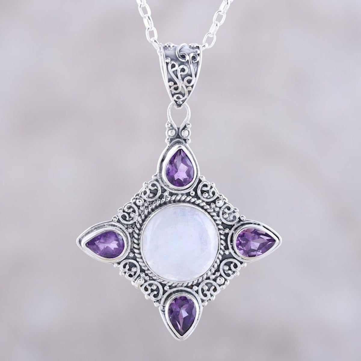 This Amethyst and Rainbow Moonstone Silver Pendant Necklace 'Eternal Delight' is a sophisticated and glamorous piece by Shanker. The sterling silver pendant carries two carats of sparkling amethysts that frame a stunning rainbow moonstone center. The intricate scrollwork highlights the pride in his craftsmanship. This necklace reflects his perseverance, tradition, and passion for his craft, and it is a beautiful blend of artistry and dedication.