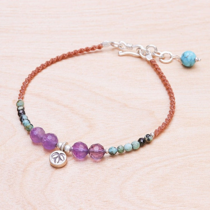 This Amethyst and Reconstituted Turquoise Beaded Cord Bracelet 'Boho Baubles' is a handcrafted piece by Samart Takham. A twist of waxed polyester cord gives way to a series of faceted amethyst and reconstituted turquoise beads, with a Karen hill tribe 950 silver charm at the center. The bracelet features a hook clasp and an extender chain. This piece is a beautiful example of her work, which preserves generational knowledge and carries the spirit of Thai heritage and family artistry.