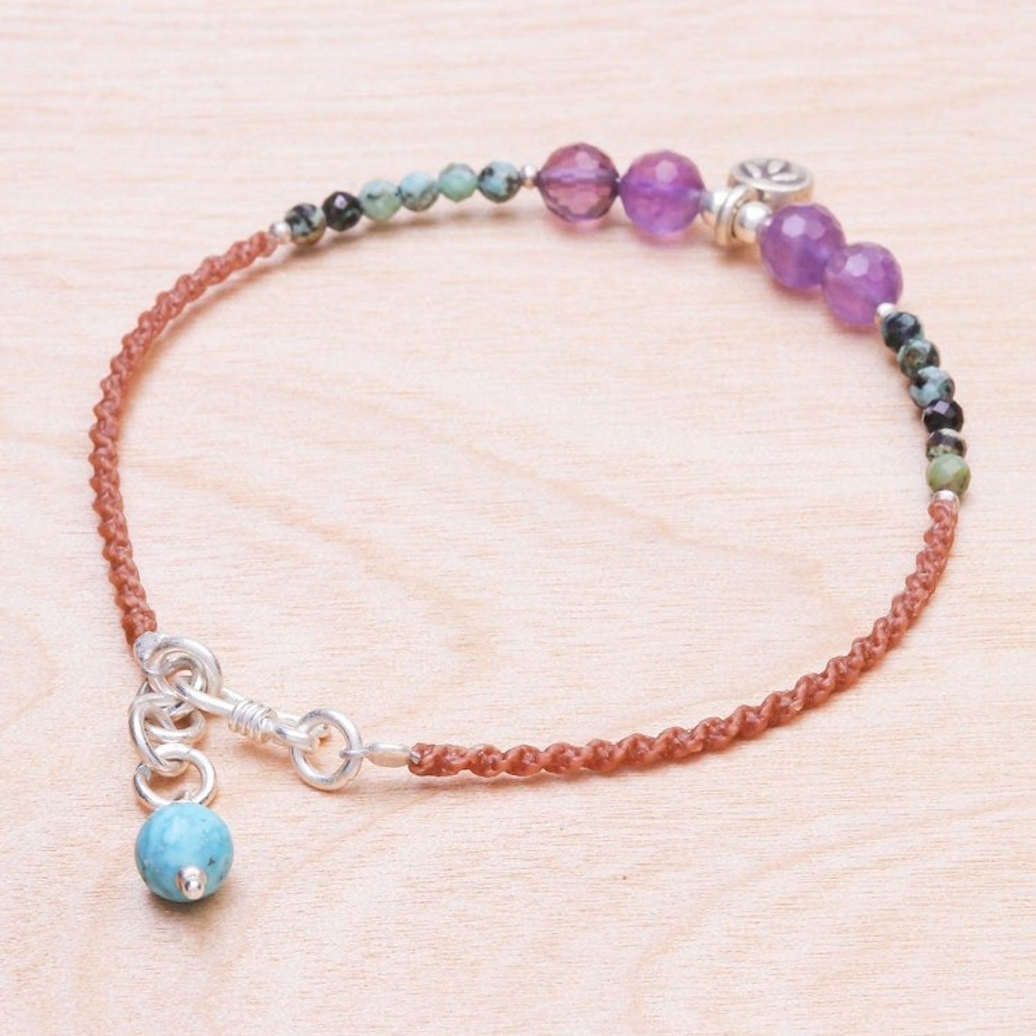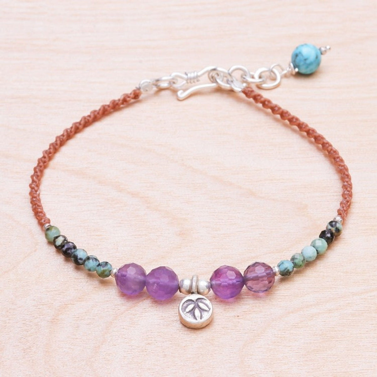 Handcrafted in Thailand, this bracelet is made from 925 sterling silver, 950 silver, amethyst, reconstituted turquoise, and waxed polyester cord. It features a combination finish and an S-hook or hook clasp. The bracelet is 7 inches L, with a 0.6-inch extender.