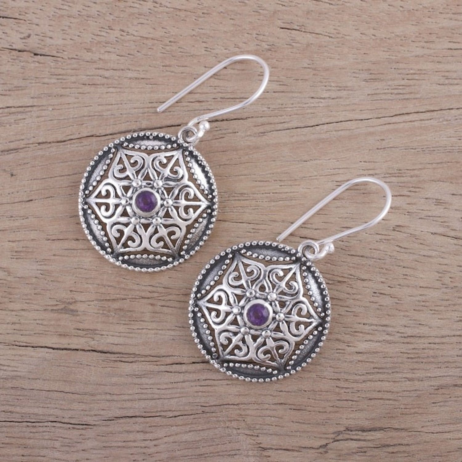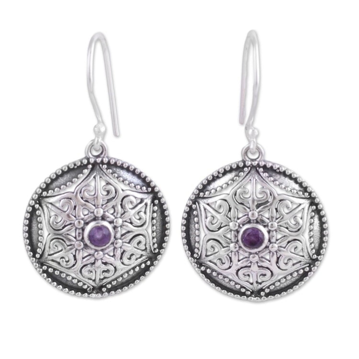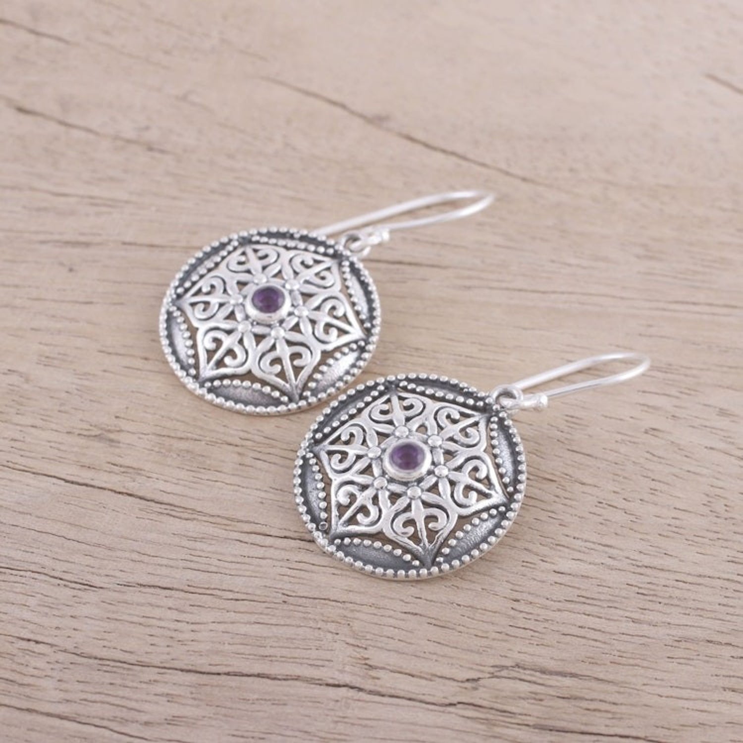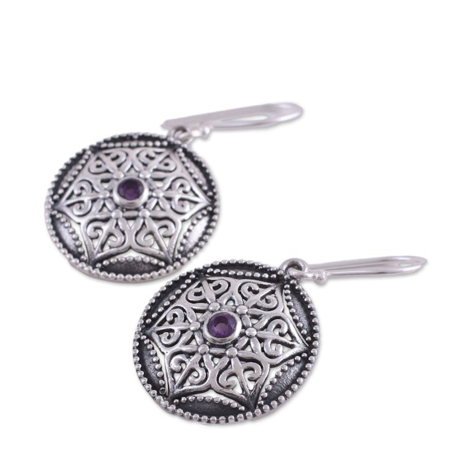 These Amethyst and Silver Floral Dangle Earrings form India 'Untouched Beauty' are a beautiful and classic piece by Parul. The circular dangle earrings feature flowers with an 'untouched beauty' crafted from sterling silver. Each earring is fitted with a petite amethyst in the center. The combination of traditional Indian styles and modern touches makes this piece both classic and contemporary.