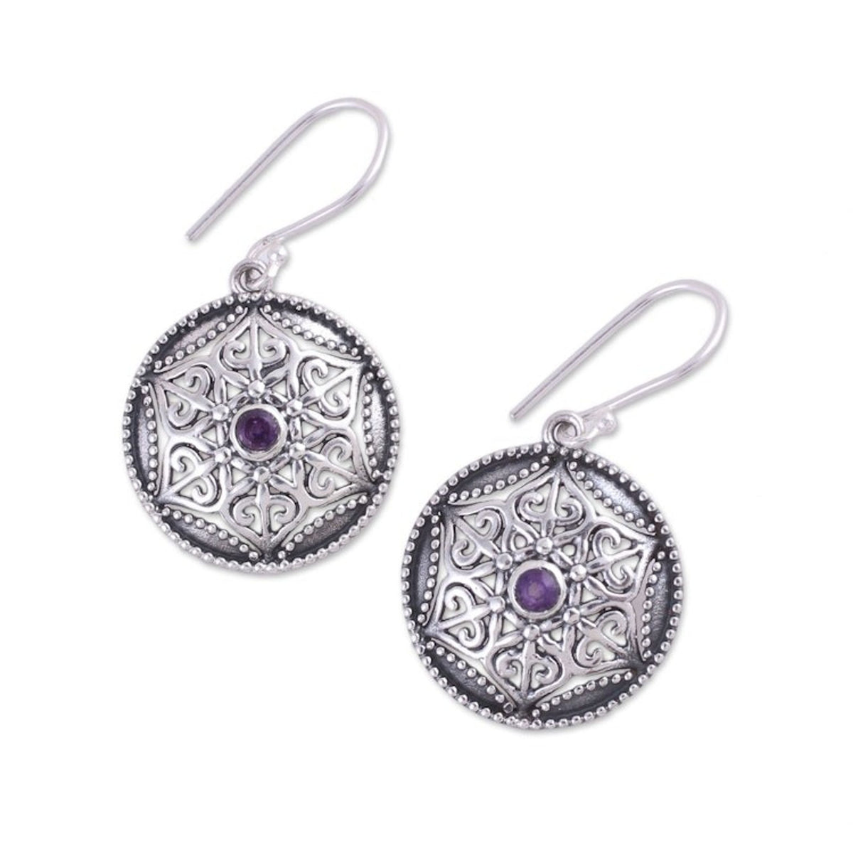 Handcrafted in India, these earrings are made from 925 sterling silver and amethyst. They feature a combination finish, measure 1.5 inches L x 0.8 inches W, and secure with hook clasps.