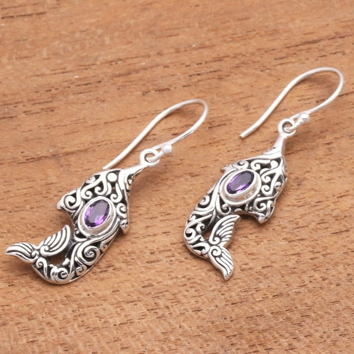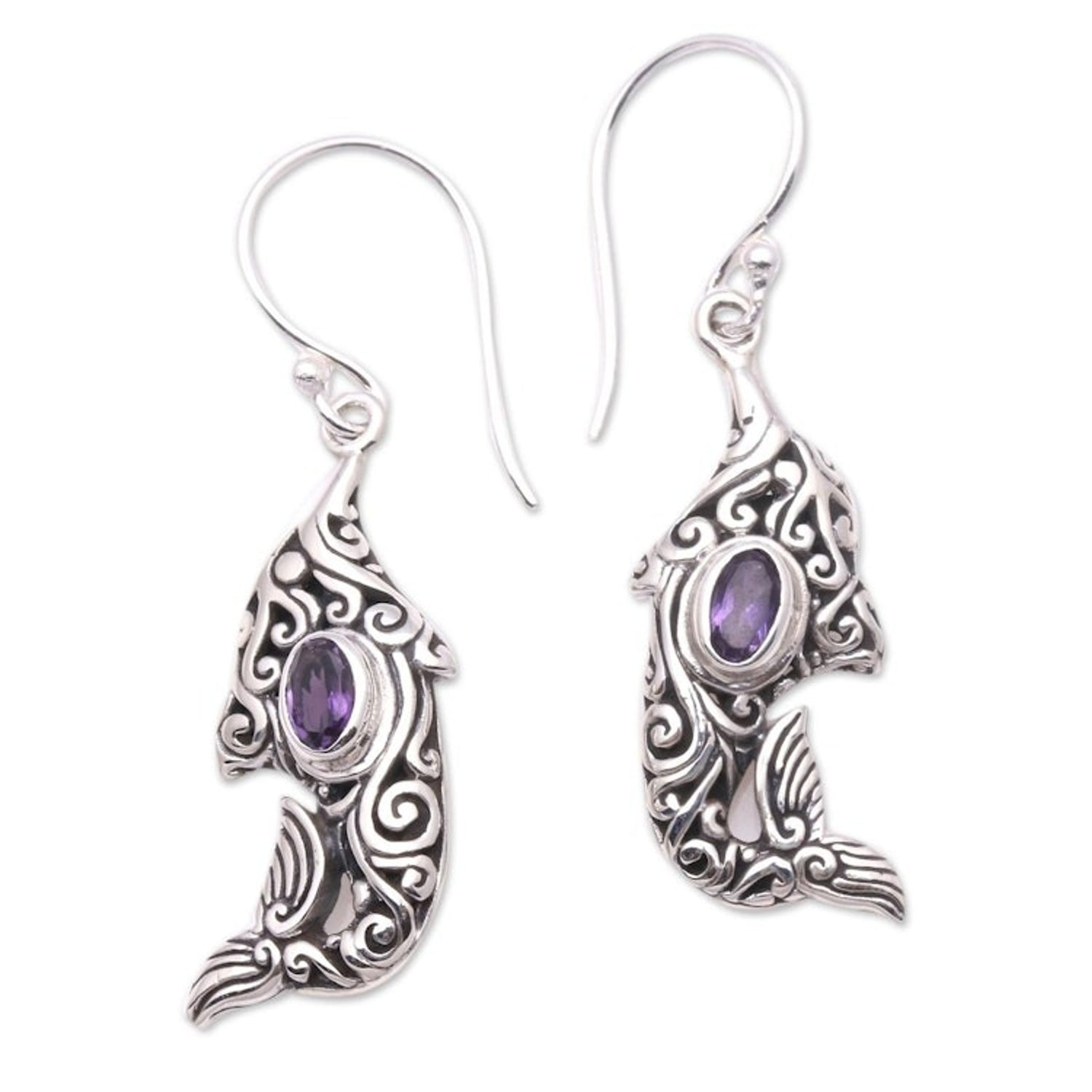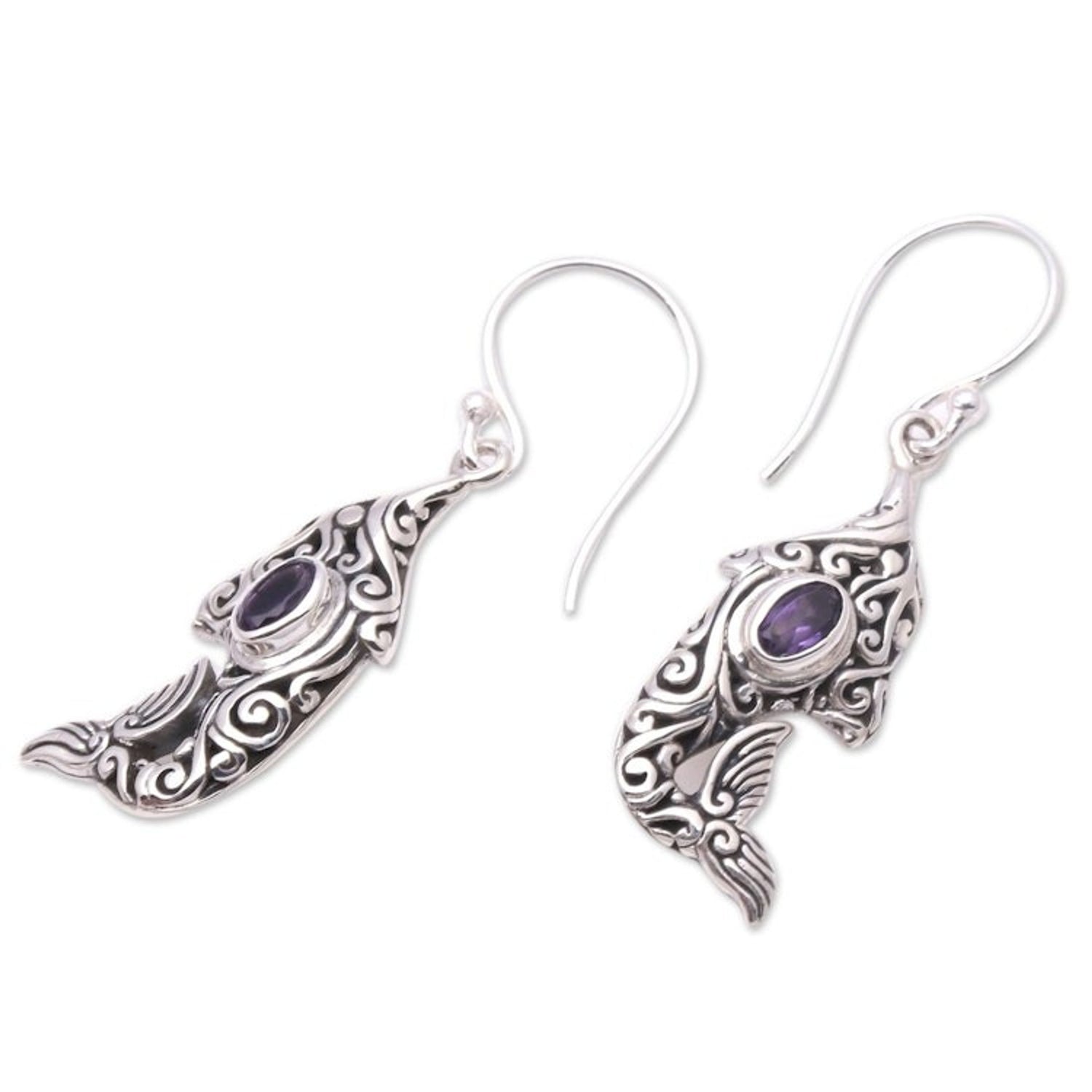 Amethyst and Sterling Silver Balinese Dolphin Earrings 'Purple Dolphin'