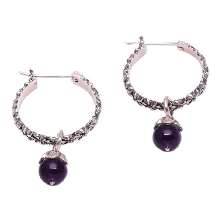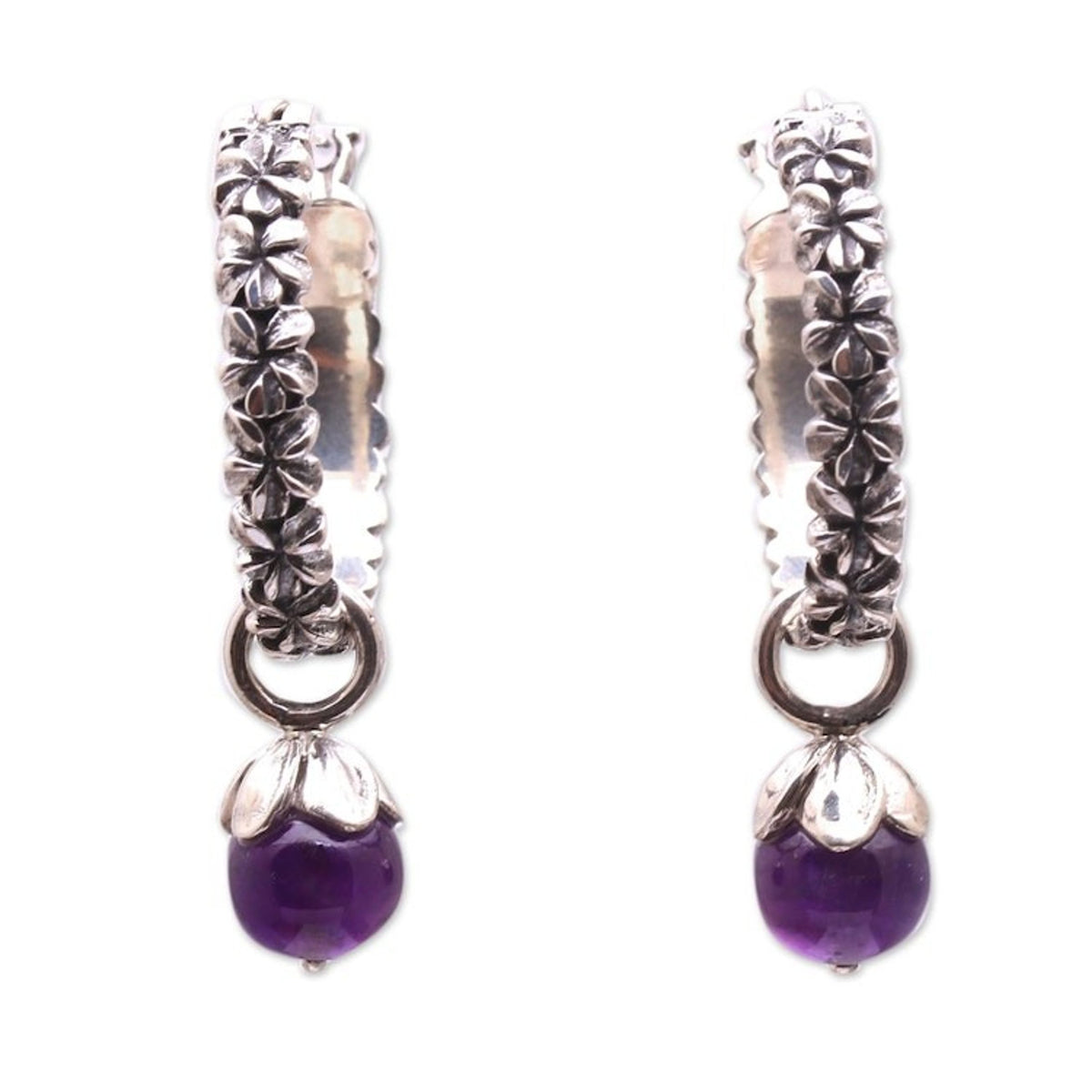 Amethyst and Sterling Silver Floral Motif Hoop Earrings 'Budding Spirit'