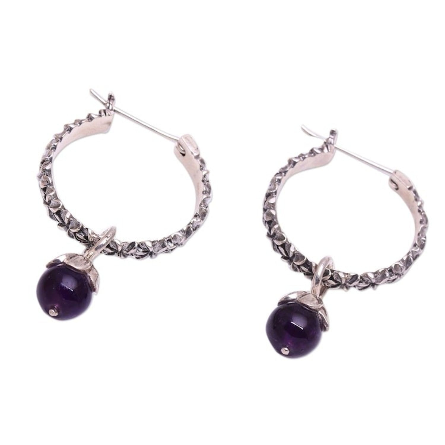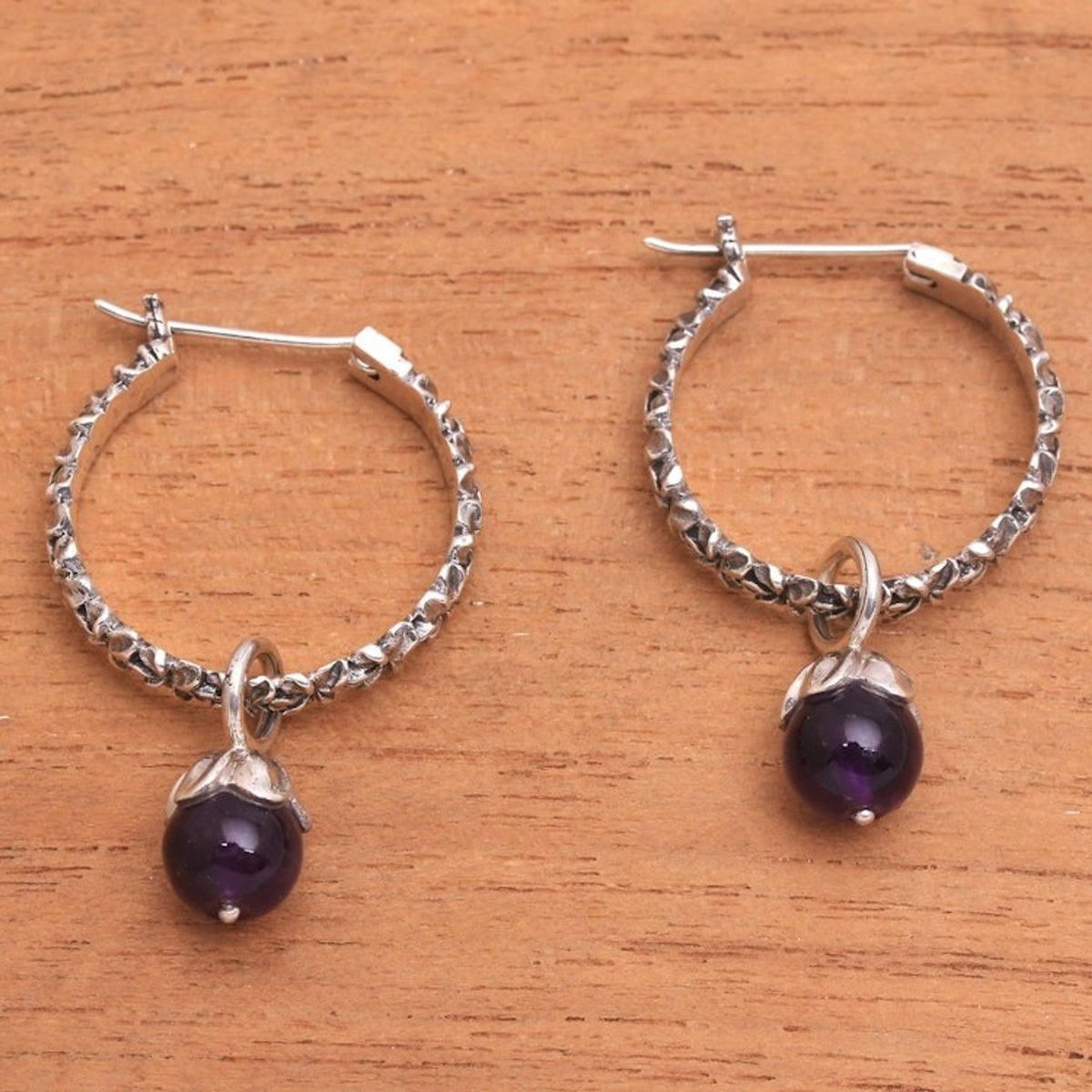 These Amethyst and Sterling Silver Floral Motif Hoop Earrings 'Budding Spirit' are a sweet pair of hoop earrings by Kenari. An amethyst bead held in sterling silver leaves hangs from a circle of petite sterling silver flowers. These handcrafted earrings are perfect for day or evening and reflect her creativity, precision, and perseverance.