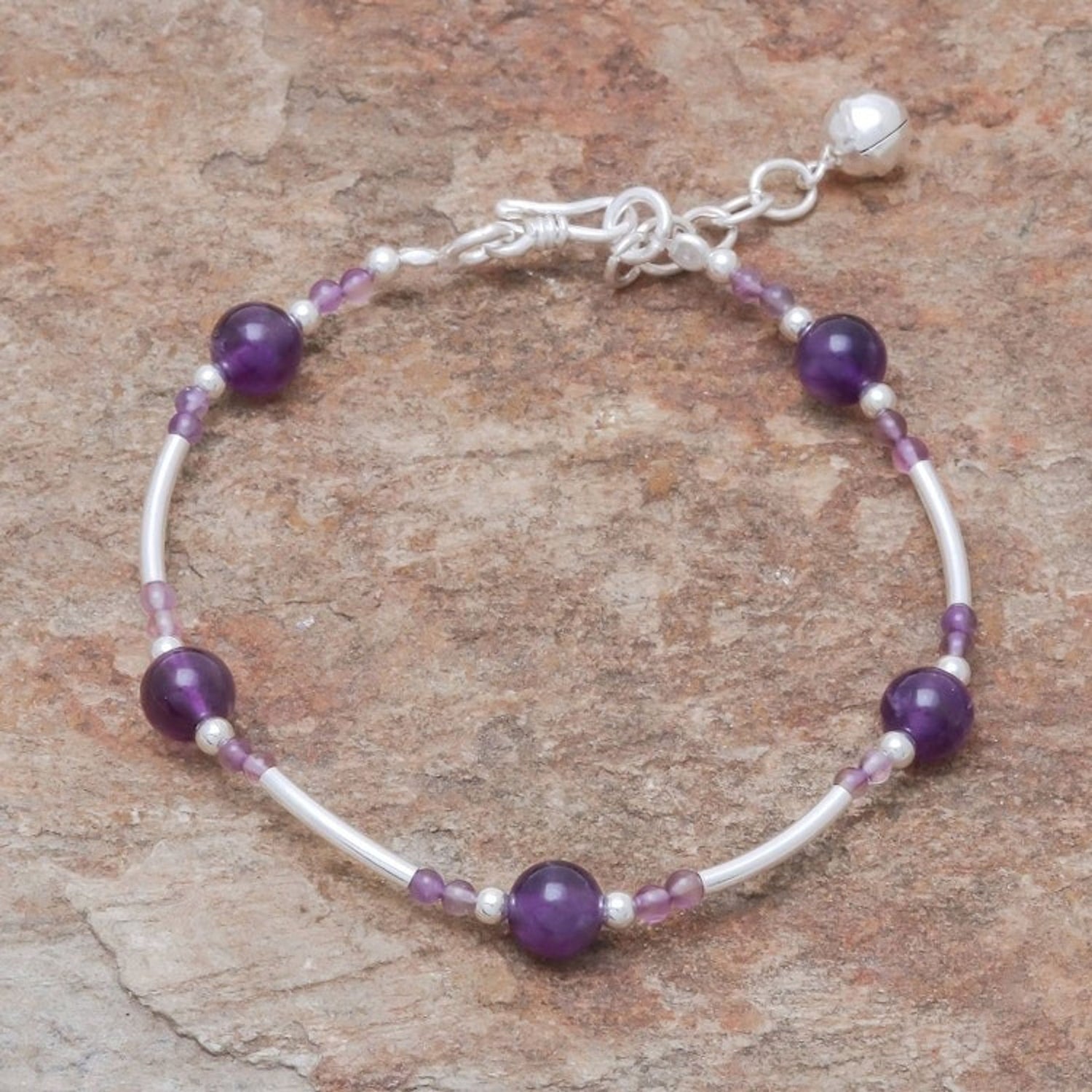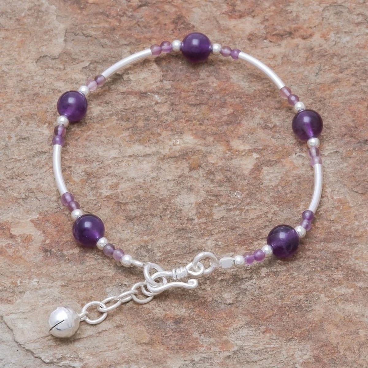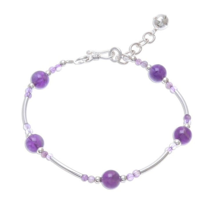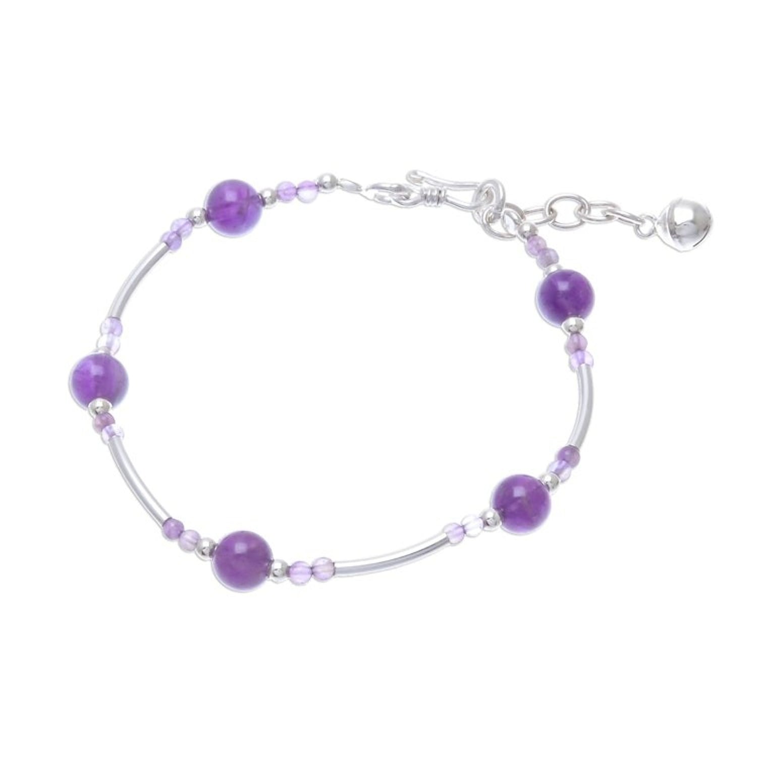 Amethyst Beaded Bracelet with a Bell Charm from Thailan 'Violet Sound'