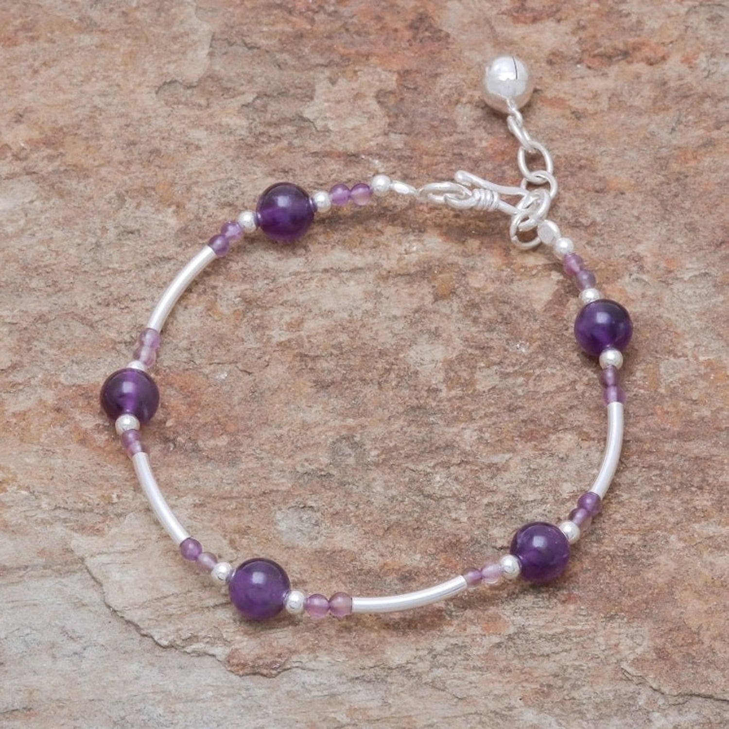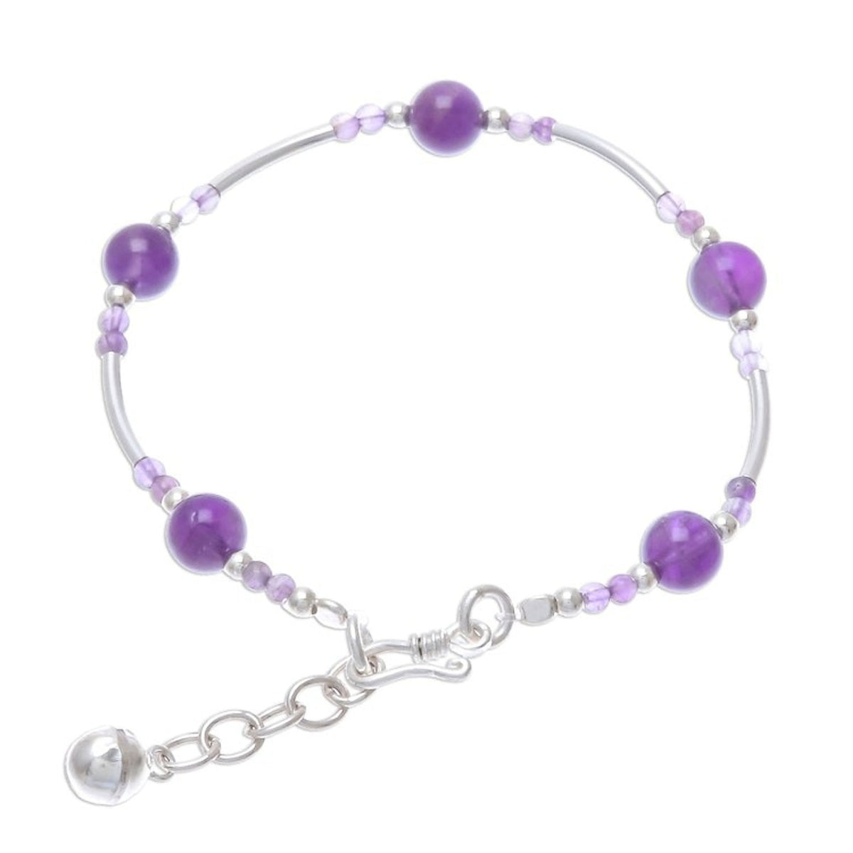 Handcrafted in Thailand, this bracelet is made from 925 sterling silver, 950 silver clasp and extender chain, and amethyst. It features a high-polish finish and an S-hook or hook clasp. The bracelet is 6.8 inches L, with a 0.8-inch extender and a bell charm that produces sound.