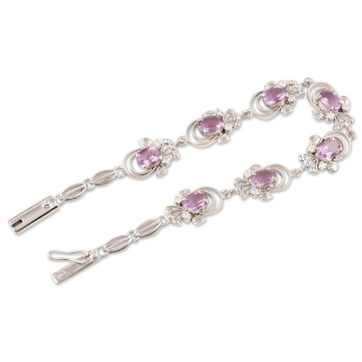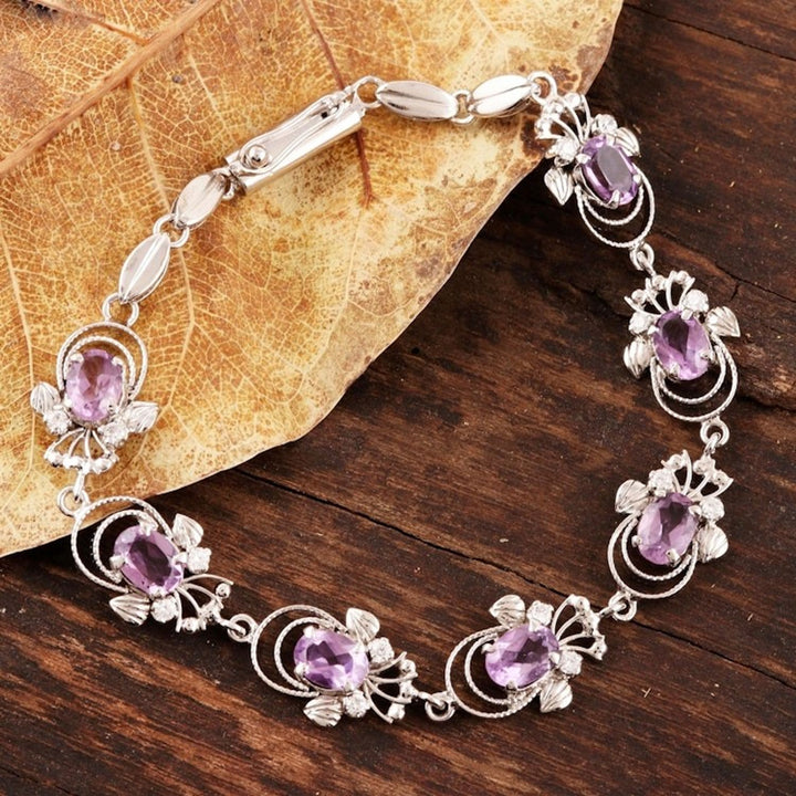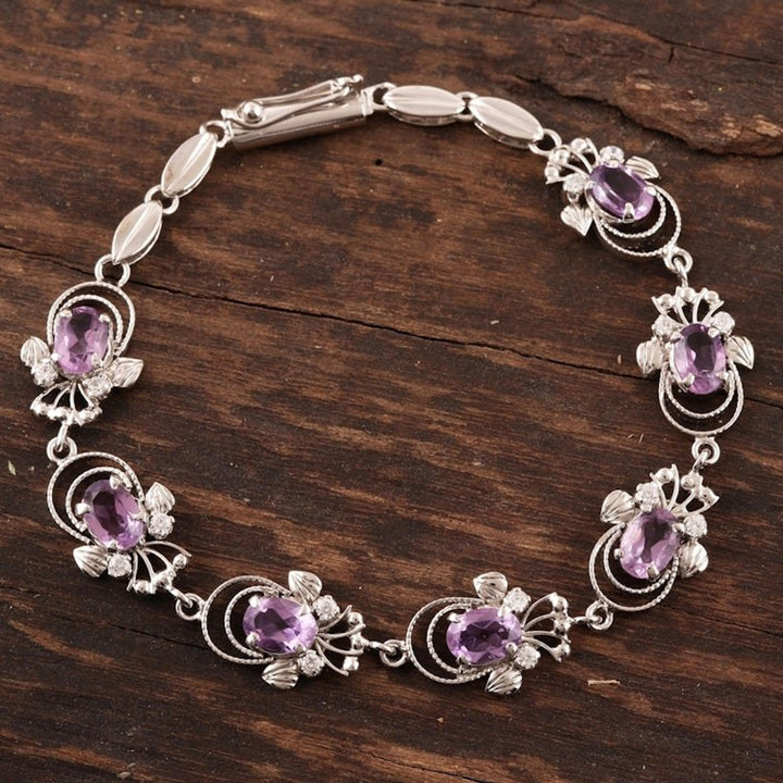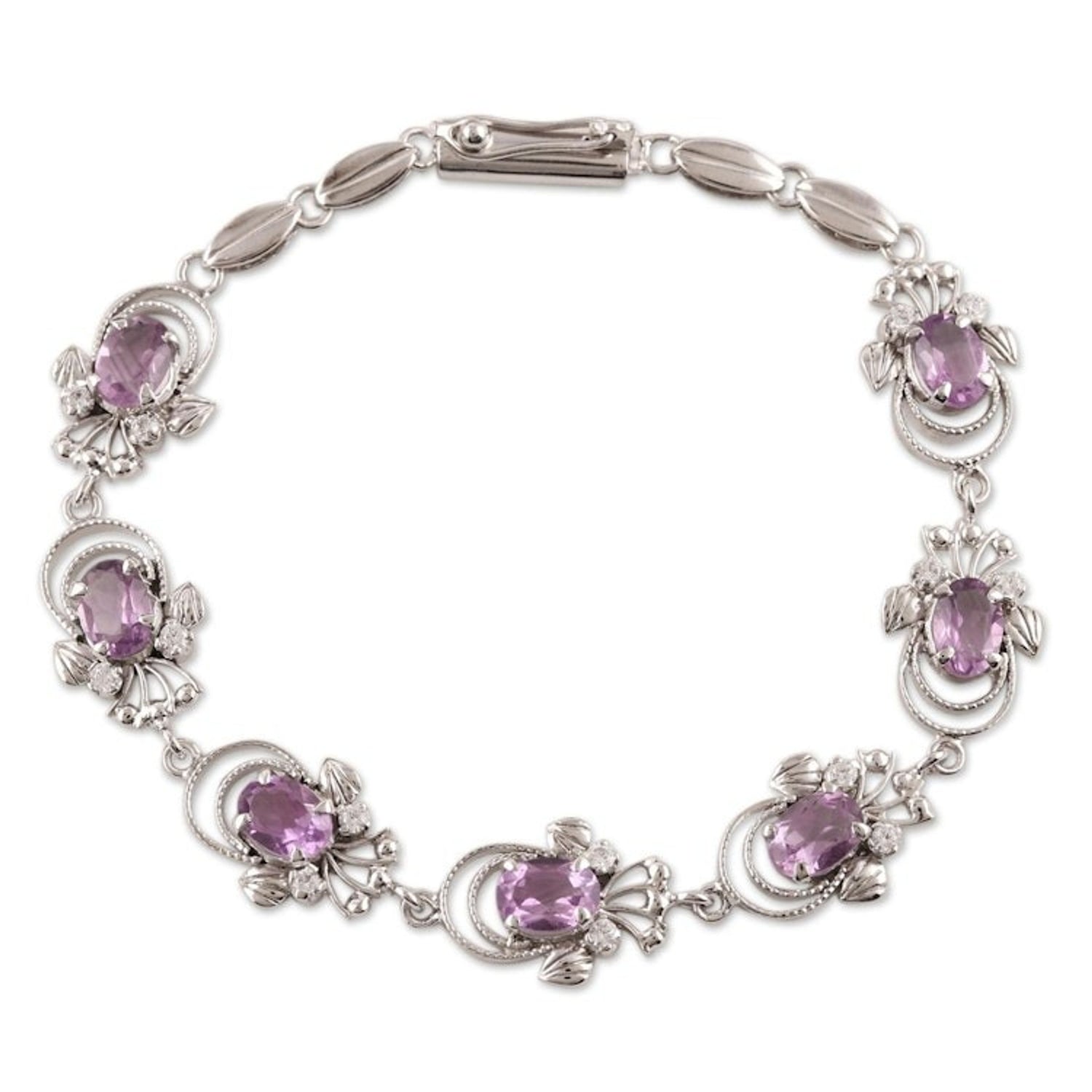 Handcrafted in India, this bracelet is made from rhodium-plated 925 sterling silver, amethyst, and cubic zirconia. It features a high-polish finish, measures 7.8 inches L x 0.4 inches W, and secures with a box clasp.