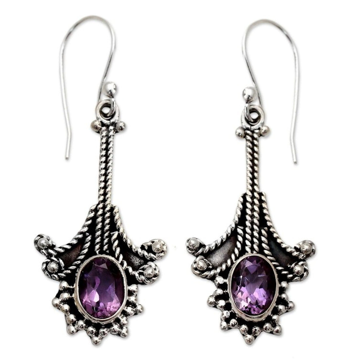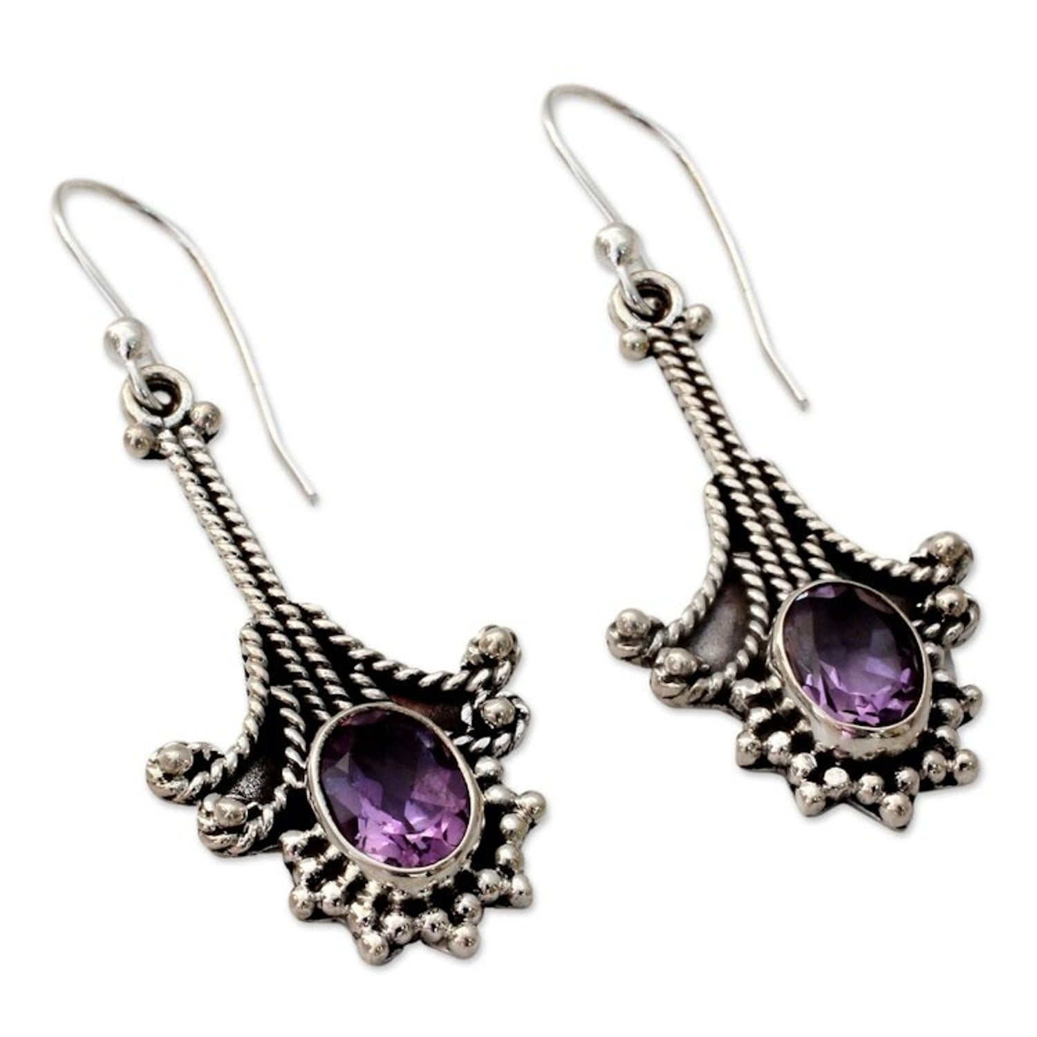 Handcrafted in India, these earrings are made from sterling silver and amethyst. They feature an oxidized finish, measure 1.8 inches L x 0.7 inches W, and secure with hook clasps.