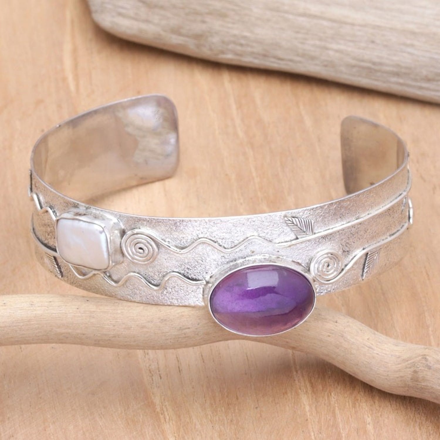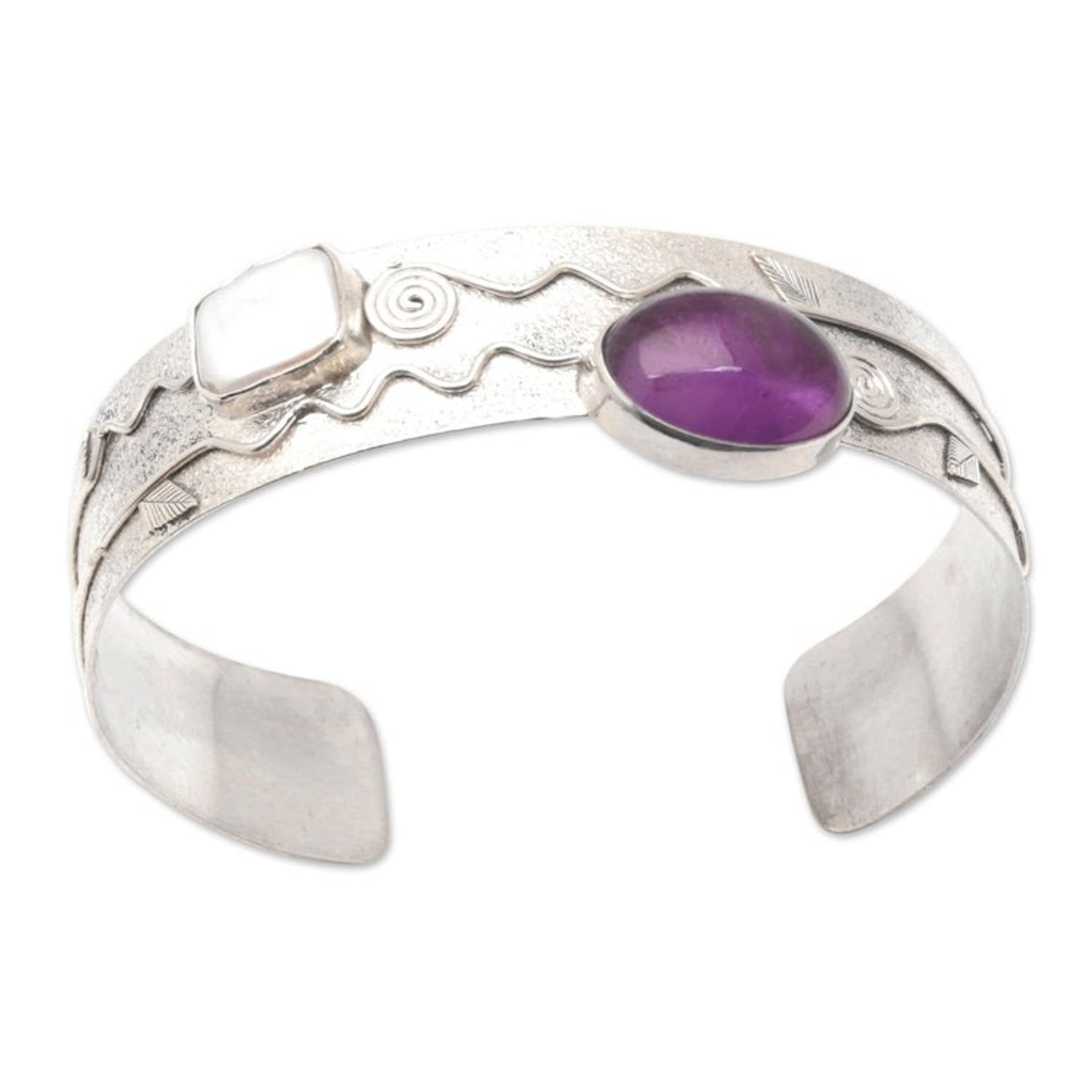 Handcrafted in Indonesia, this cuff bracelet is made from 925 sterling silver, amethyst, and cultured Biwa pearl. It features a sandblasted finish and measures 6 inches L x 0.7 inches W.