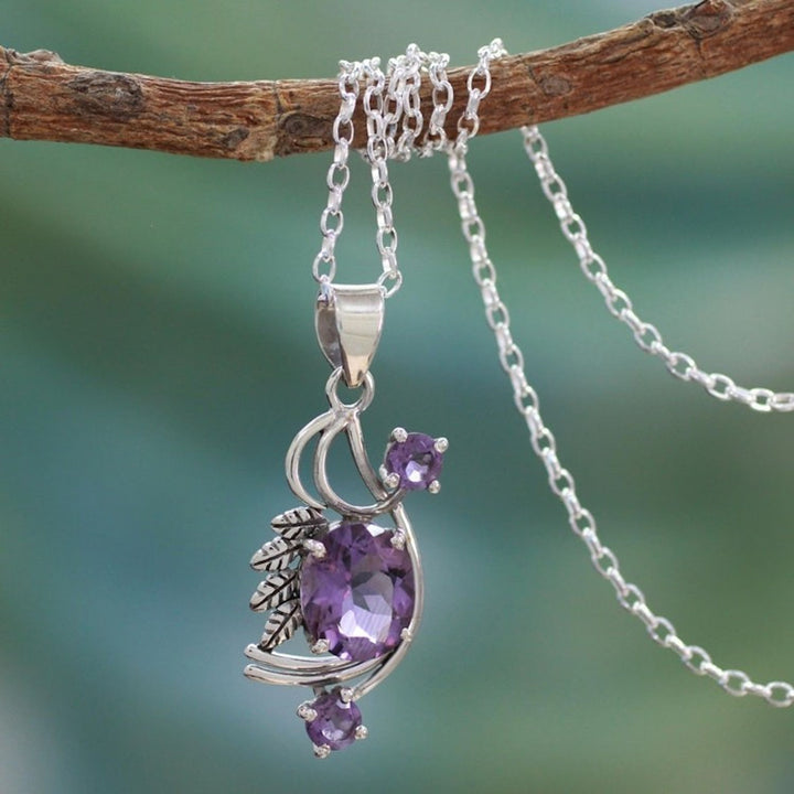 This Amethyst pendant necklace 'Mughal Romance' is a beautiful piece by Shanker. Nestled amid leaves and curling vines, amethysts glisten with tempting elegance. The sterling silver pendant is crafted by hand, features 6 gemstone carats, and is worn on a sleek rolo chain. This piece is a beautiful reflection of his dedication and creativity, and it is a testament to his commitment to quality and originality.