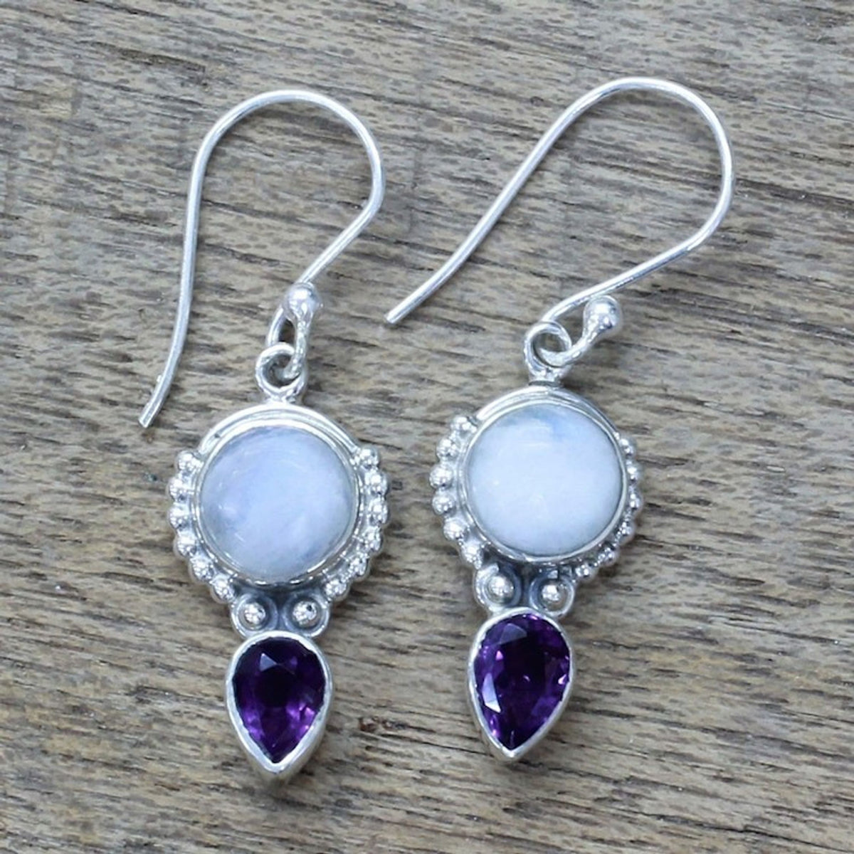 Handcrafted in India, these earrings are made from 925 sterling silver, amethyst, and rainbow moonstone. They feature a high-polish finish, measure 1.5 inches L x 0.4 inches W, and secure with hook clasps.