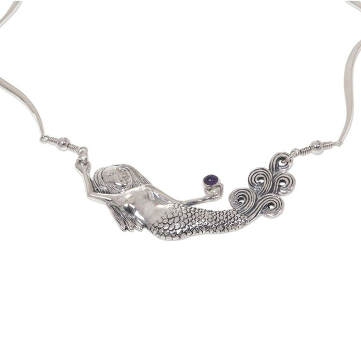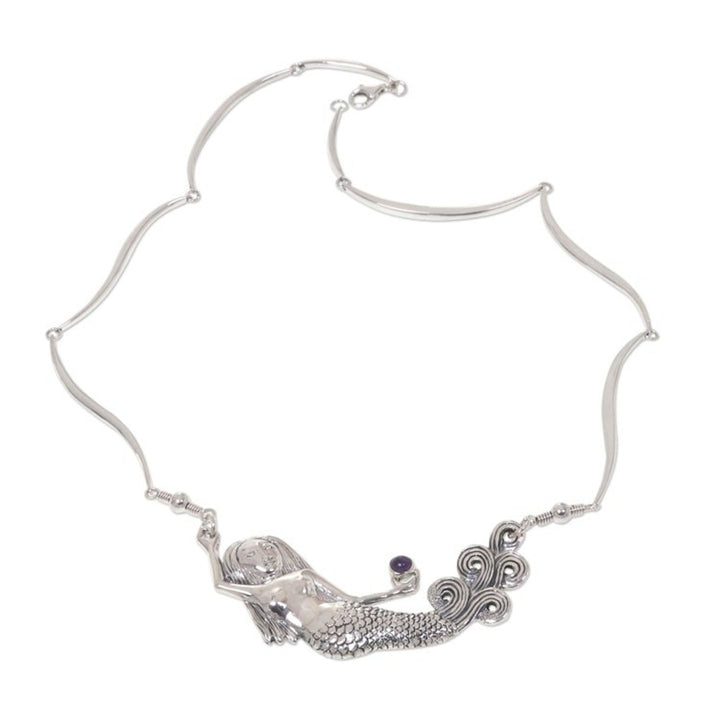 This Amethyst Sterling Silver Pendant Necklace 'Mermaid Spell' is a unique piece by Nyoman Rena. A duyung (mermaid) graces this necklace with her delicate beauty. She holds in her hand an amethyst. The necklace is crafted from sterling silver with superb detail. This piece is a beautiful blend of his carving skills with metalwork, and it captures both Balinese heritage and contemporary design.