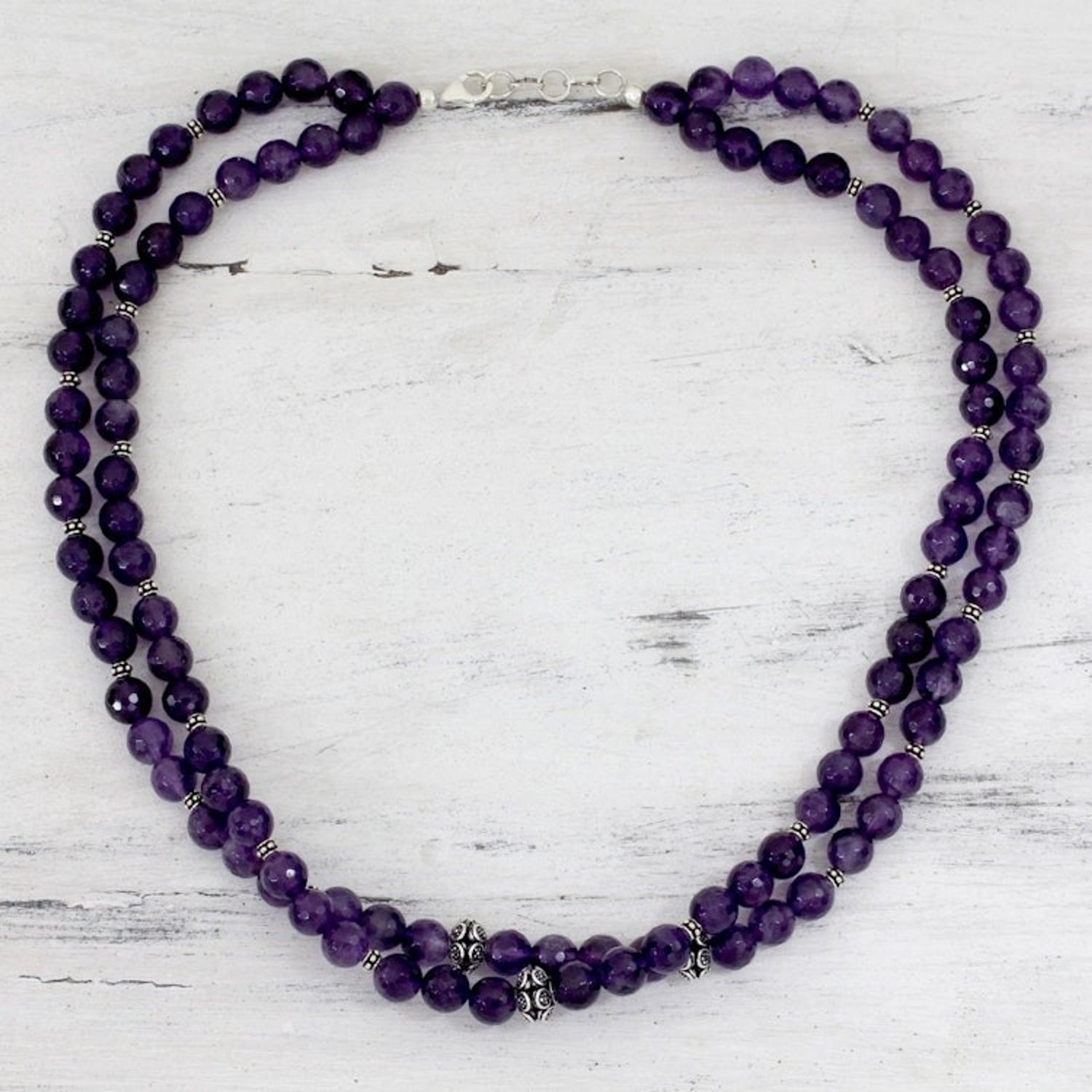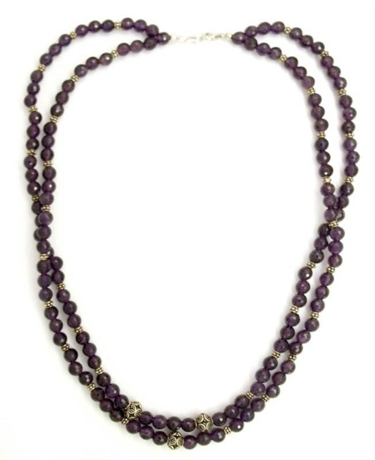 This Amethyst strand necklace 'Wisdom's Fortune' is a dazzling piece by Narayani. The stone of dreams, wisdom and protection, amethyst, dazzles in a two-strand necklace. She threads the round, faceted gems along with florid sterling spacers in a design unique to Indian fashions. This piece is a beautiful reflection of her innate elegance and her enduring love for beauty.