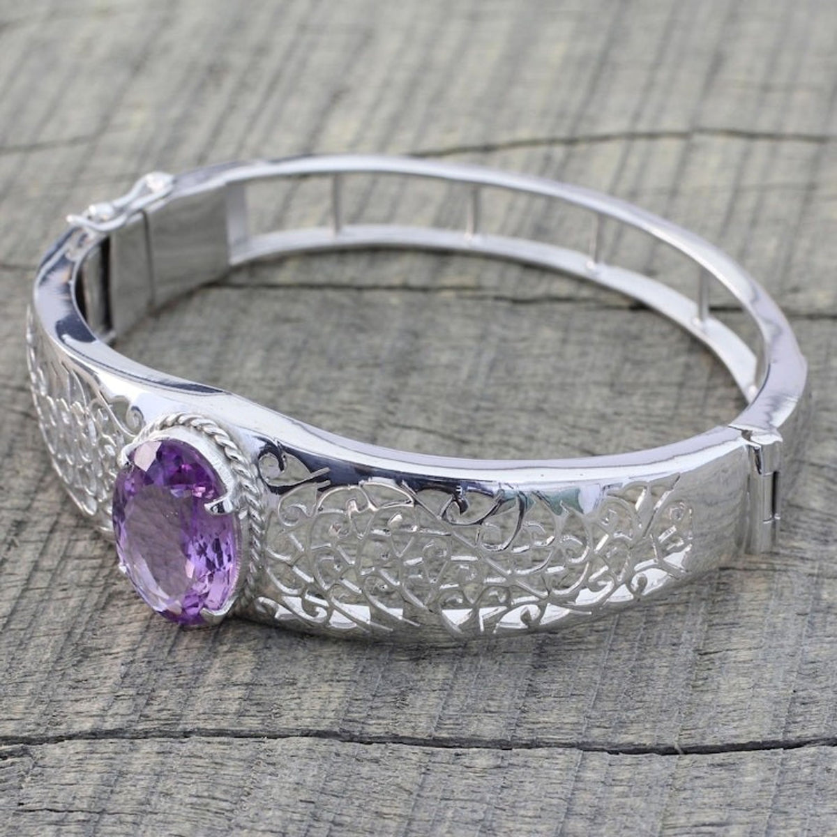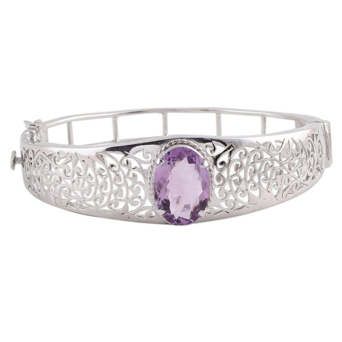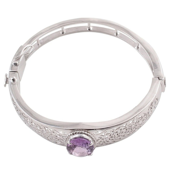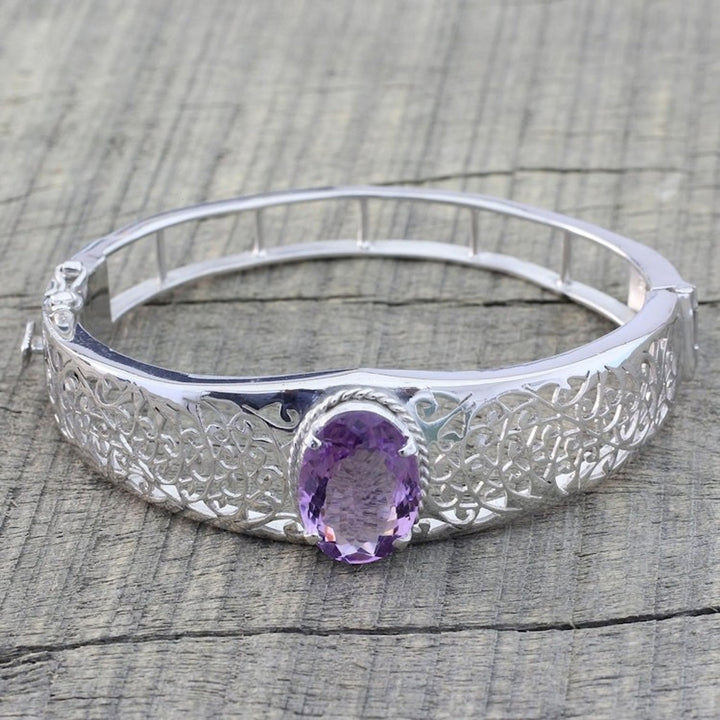 Handcrafted in India, this wristband bracelet is made from rhodium-plated 925 sterling silver and amethyst. It features a high-polish finish, measures 6.5 inches in inner circumference, and secures with a hidden box clasp.