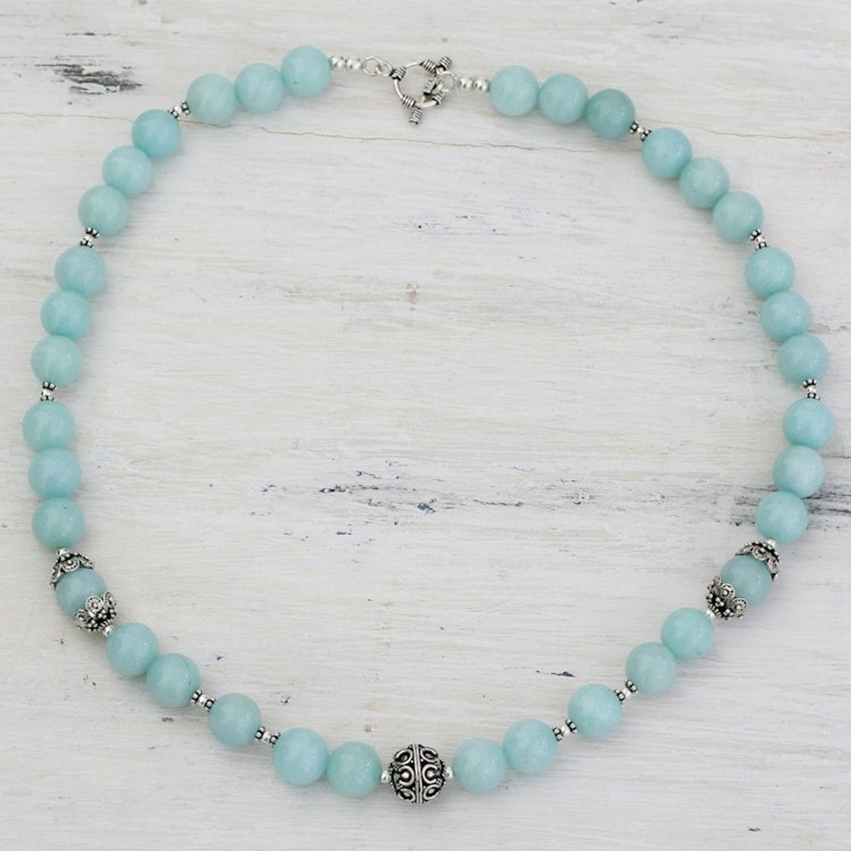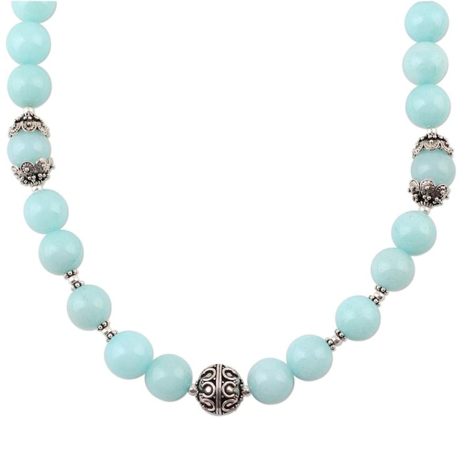 This Aqua Aventurine and Sterling Silver Beaded Necklace 'Morning Dance' is a captivating piece by Narayani. The cheerful tones of aqua aventurine captivate the eye in this beaded necklace. Sterling silver beads accentuate the beautiful color of the gemstones. This piece is a beautiful reflection of her innate elegance and her enduring love for beauty.