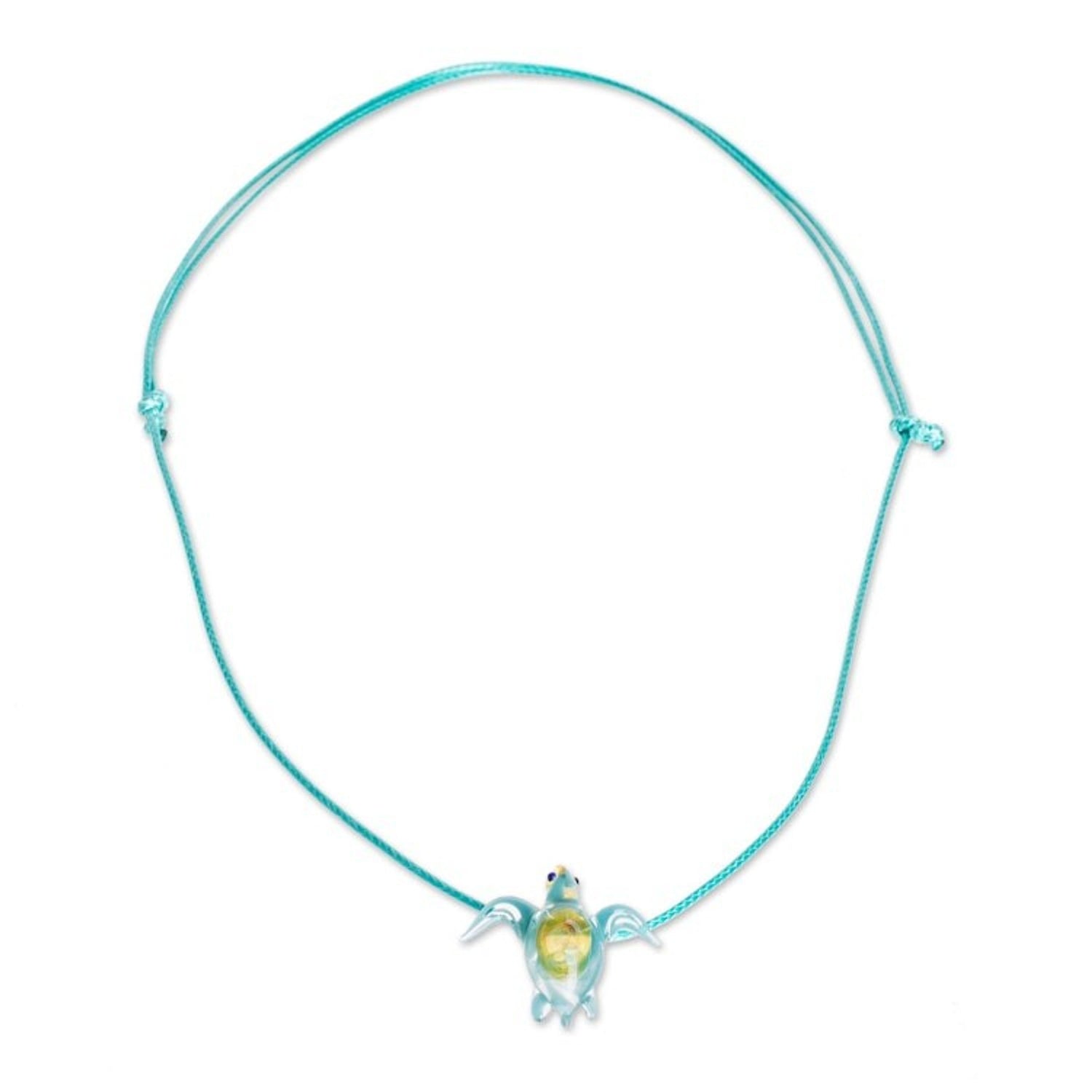 This Art Glass Sea Turtle Pendant Necklace by Independent Artisans, aptly named 'In the Ocean,' is a delicate and enchanting piece from Costa Rican artisan Guisselle Mora. The sea turtle pendant is delicately hand-blown from glass, evoking the serene beauty of the ocean with tiny bubbles created from the intricate crafting process. The pendant hangs on an adjustable cotton cord necklace in a soothing sky-blue color, allowing the wearer to find the perfect length. This piece is a beautiful expression of the artisan's faith, perseverance, and love for nature, and a reminder of the tranquil beauty found in the world's oceans.