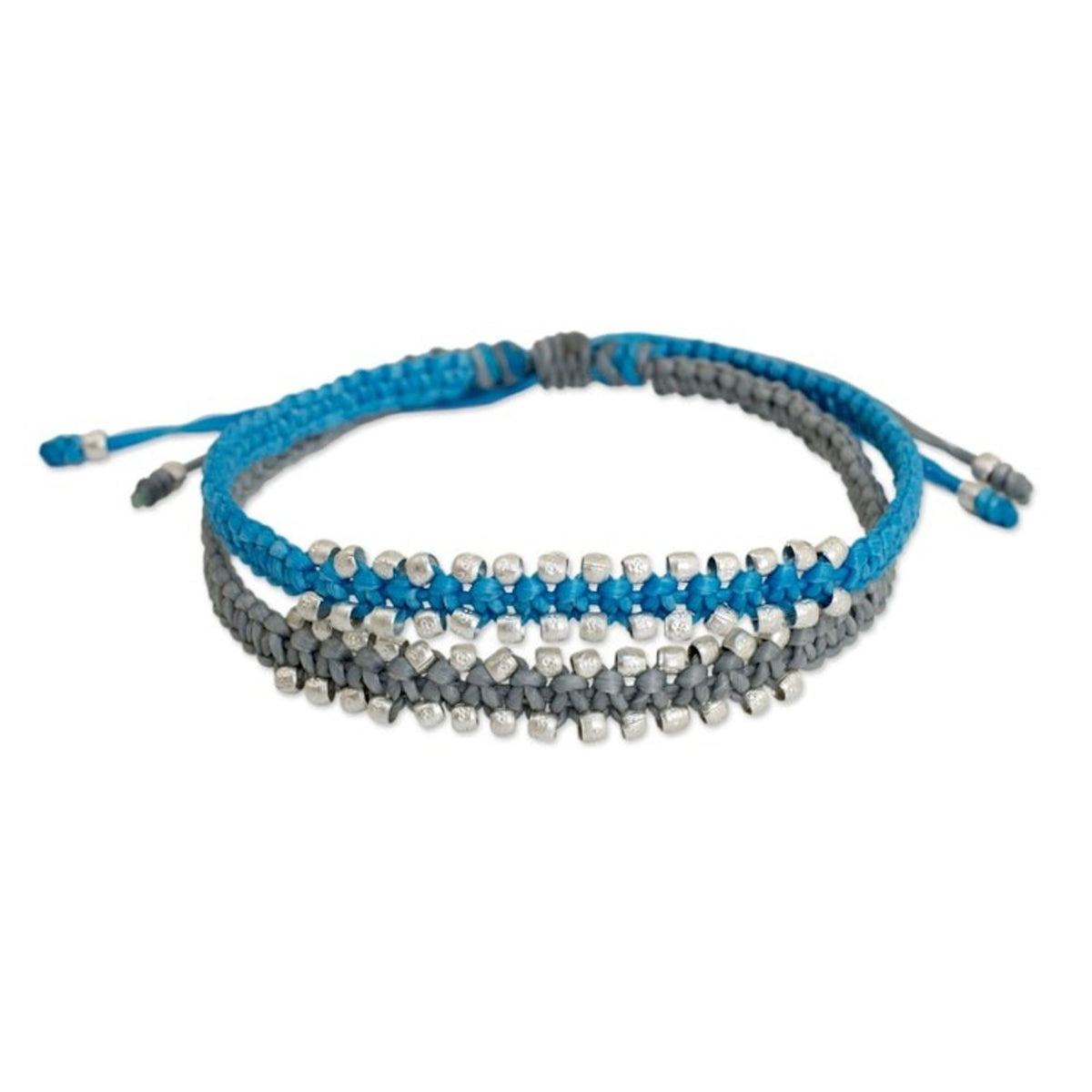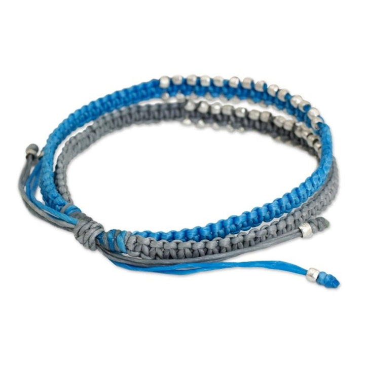 This Artisan Braided Bracelet by Independent Artisans, titled 'Blue-Gray Urban Siam,' is a perfect harmony of color and texture from Thai designer Napapat. She expertly braids two waxed polyester cords by hand, joining them into a single piece with a sliding knot that allows for an adjustable fit. The design is centered by florid sterling silver-plated brass beads, which add a feminine and elegant touch to the urban-inspired color palette. This bracelet reflects the artisan's dedication, patience, and imagination, offering a lasting connection to Thai tradition with a modern twist.
