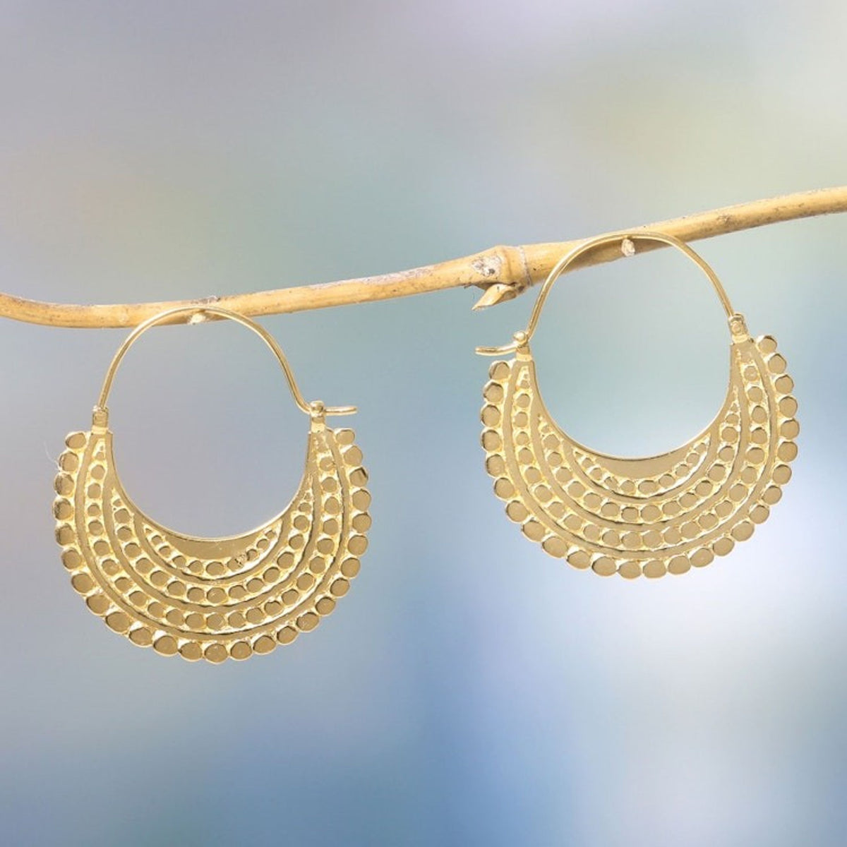 These Artisan Crafted 22k Gold Plated Hoop Style Earrings by Independent Artisans, named 'Golden Crescent,' are a knockout design from Balinese artisan Nyoman Rena. These elegant hoop earrings feature rows of petite Balinese-style dots, a nod to the artisan's traditional heritage. The sterling silver is bathed in gleaming 22k gold, creating a rich and luxurious aesthetic. Each piece is handcrafted using traditional tools, capturing both Balinese heritage and a contemporary fashion sensibility. These earrings are a celebration of skill, tradition, and the harmonious blend of old and new.