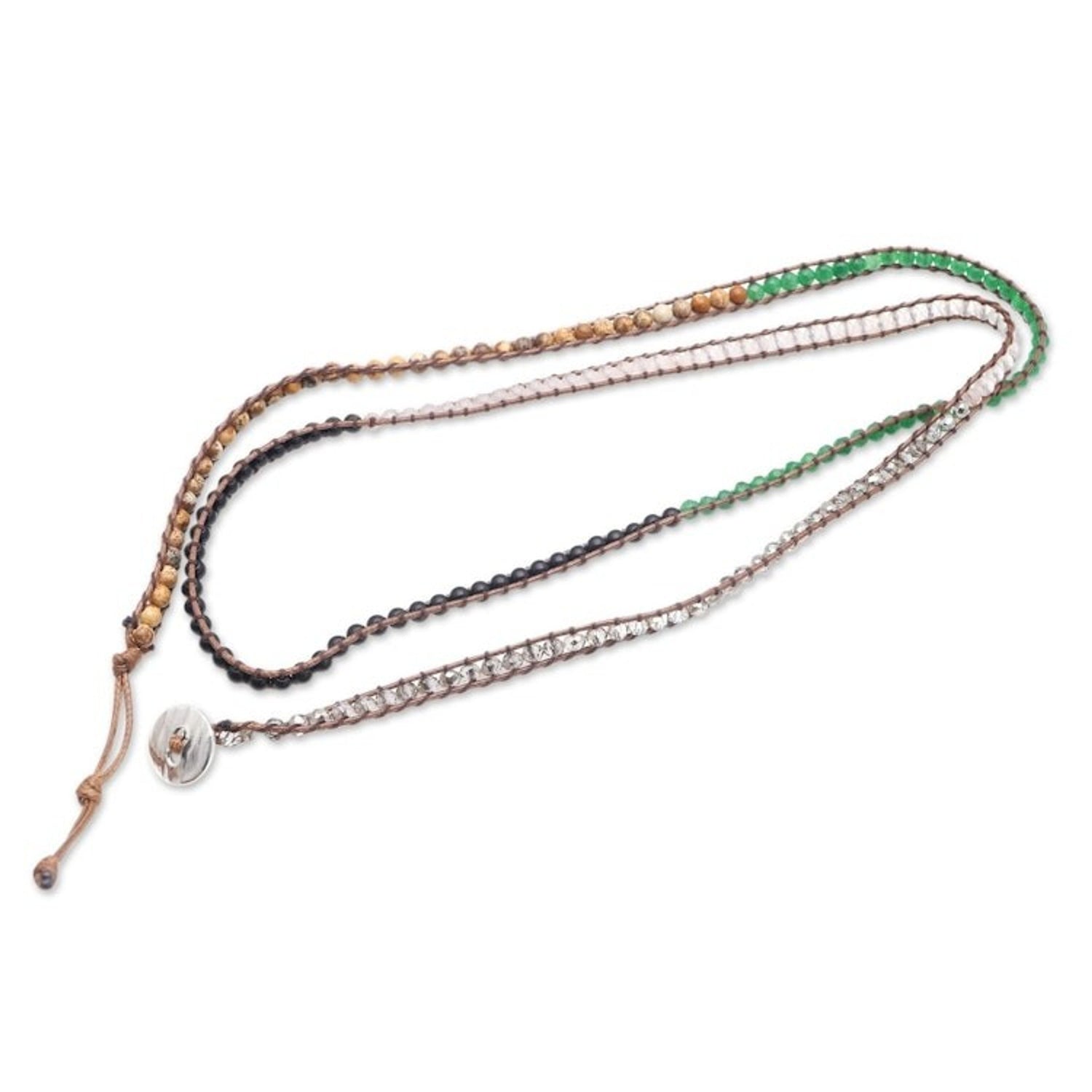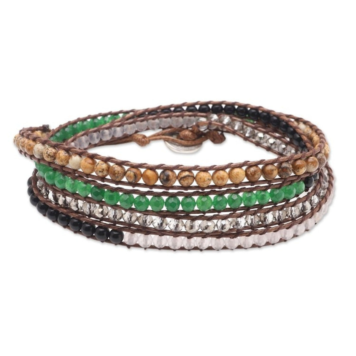 Hand-threaded on a strong cotton cord, this wrap bracelet features onyx, agate, jasper, rose quartz, and crystal beads with a .925 sterling silver button clasp, measuring a length adjustable from 34.5 inches min L to 37 inches max L.