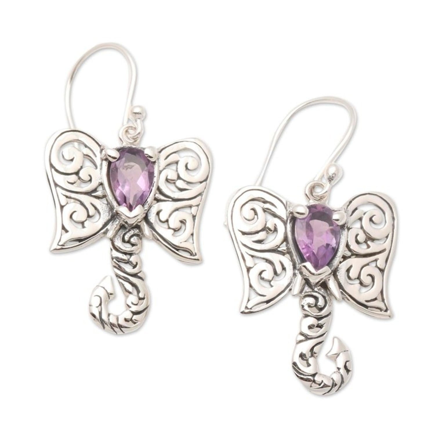 Artisan Crafted Balinese Silver Elephant Amethyst Earrings 'Elephant Fancy'