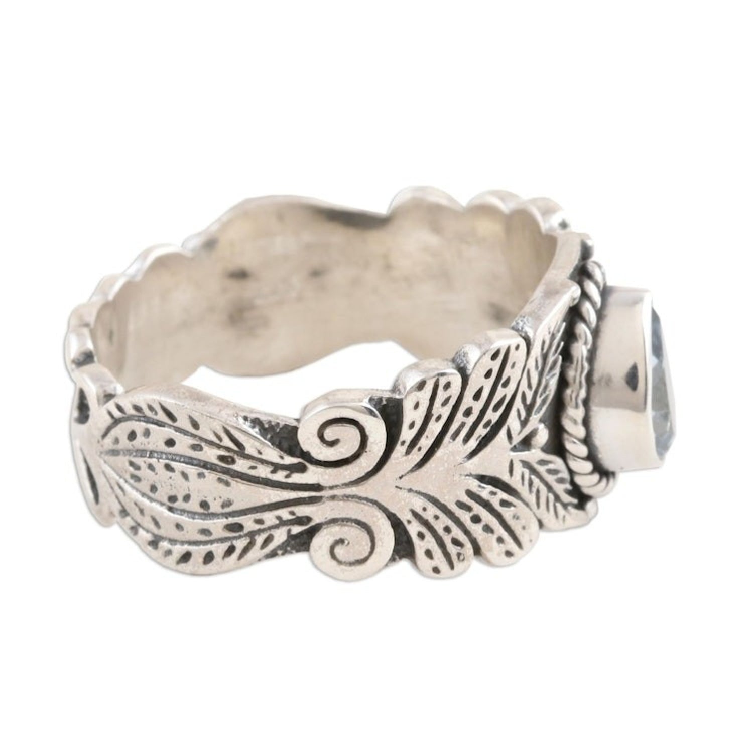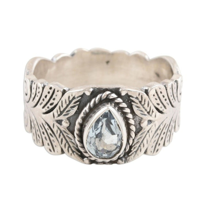 This Artisan Crafted Blue Topaz and Sterling Silver Band Ring by Independent Artisans, named 'Iridescent Drop,' is an exquisite creation from Indian designer Parul. The ring features a teardrop-shaped blue topaz gemstone at its center, which sparkles with a cool, calm energy. The band is crafted from gleaming sterling silver, with leafy fronds that elegantly encircle your finger. This piece blends traditional Indian styles with a modern touch, creating jewelry that is both classic and contemporary. It's an ideal accessory for someone who appreciates unique and original craftsmanship.