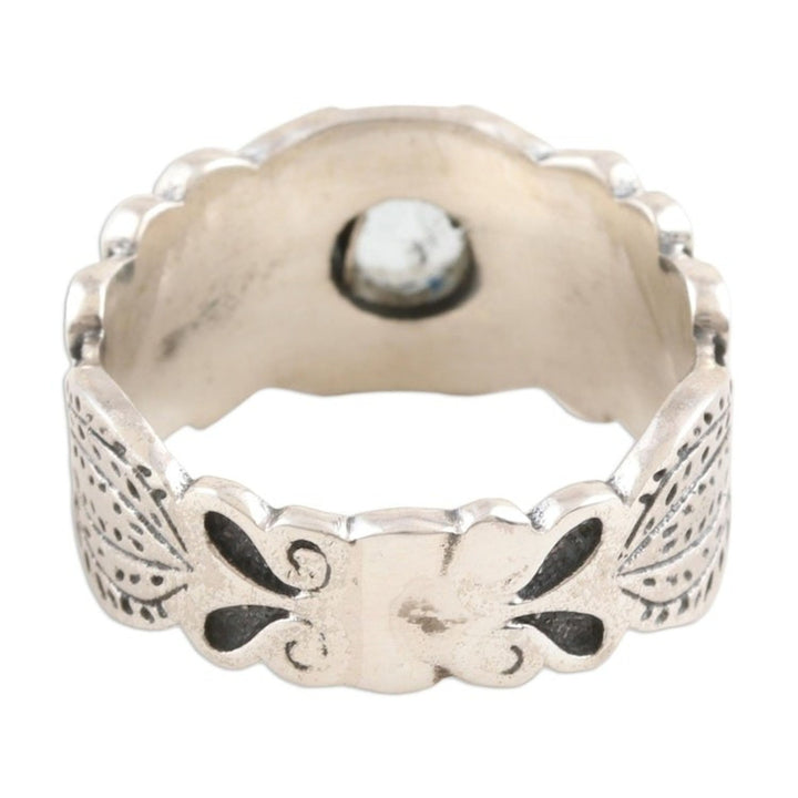 Handcrafted in India from .925 sterling silver and a blue topaz gemstone, this ring measures 0.4 inches L x 0.4 inches W at the front and a band width of 6 mm.