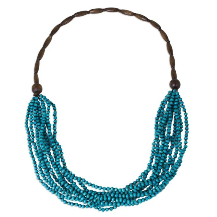 This Artisan Crafted Blue Wood Statement Necklace by Independent Artisans, titled 'Rising Summer,' is a vibrant and cheerful creation from Thai artisan Sumalee Nawakul. This hand-crafted necklace features ten elegant strands threaded with little turquoise beads. The rondelle-shaped wood beads are joined together with larger beads crafted from littleleaf boxwood, creating a dynamic and lightweight statement piece. This necklace transforms humble materials into a work of art that radiates with color and joy, reflecting the artisan's mission to uplift others through her craft.