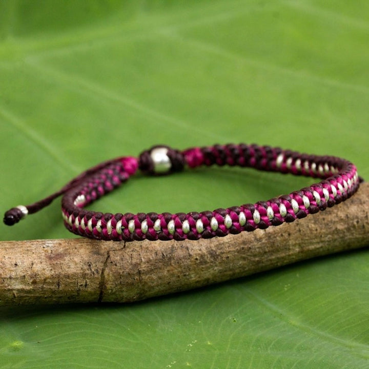 This Artisan Crafted Braided Bracelet with Silver Beads by Independent Artisans, titled 'Bringing Friendship in Magenta,' is a chic and unique design from Thai artisan Napapat. The bracelet is inspired by the vibrant traditions of the Hill Tribe artisans. Napapat hand braids deep maroon and vibrant magenta polyester cords, creating a bold and beautiful color combination. The braided cords are adorned with silver beaded accents, adding a touch of shine and texture. The bracelet features a sliding knot for easy adjustment, making it a versatile and stylish accessory.