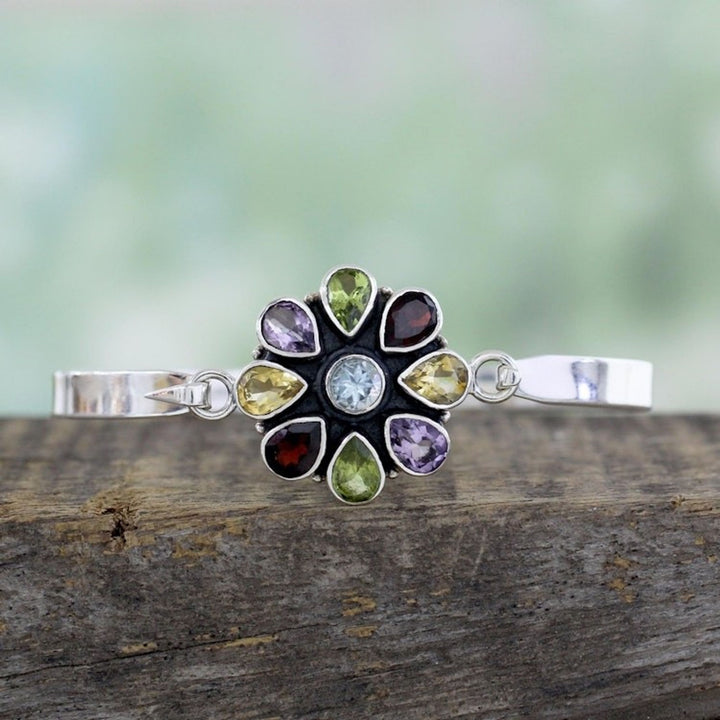 This Artisan Crafted Floral Multi-Gemstone Silver Bangle Bracelet by Independent Artisans, titled 'Floral Emblem,' is a shimmering and glistening creation from Indian artisan Neeru Goel. The sterling silver bangle features a radiant flower with petals formed by a medley of gemstones, including amethyst, blue topaz, citrine, garnet, and peridot. The bangle is secured with a small fishhook clasp for ease of wearing. This piece is a beautiful blend of heritage and refinement, showcasing the artisan's dedication to keeping India's artistry alive while experimenting with new forms and techniques.