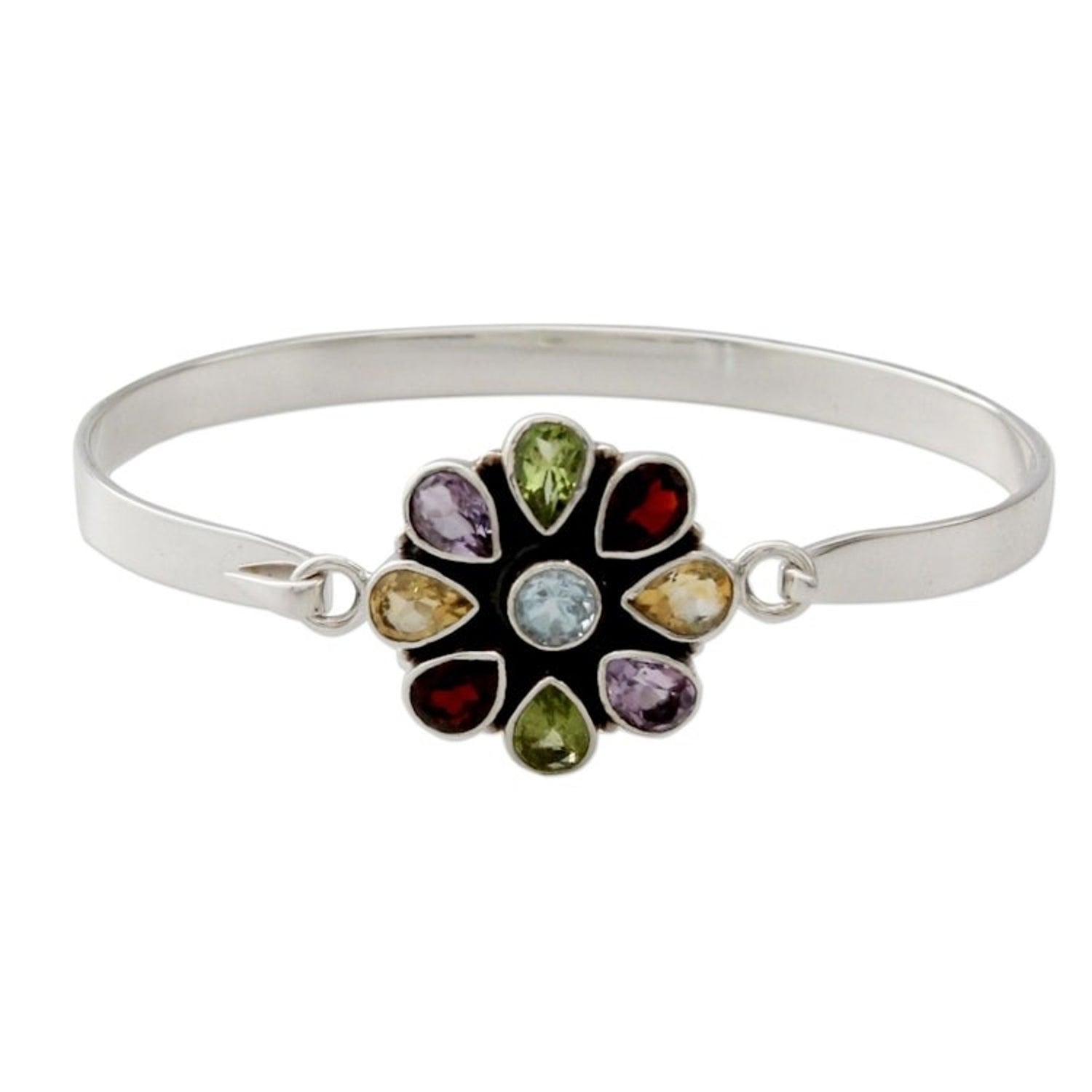 Handcrafted in India from .925 sterling silver and multiple gemstones (amethyst, blue topaz, citrine, garnet, peridot), this bangle bracelet measures 7.8 inches L x 0.2 inches W with a 1.3-inch L x 1-inch W pendant.