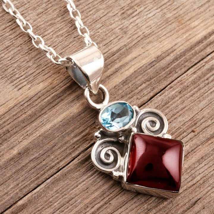 Artisan Crafted Garnet and Blue Topaz Pendant Necklace 'Rainbow Fragments'