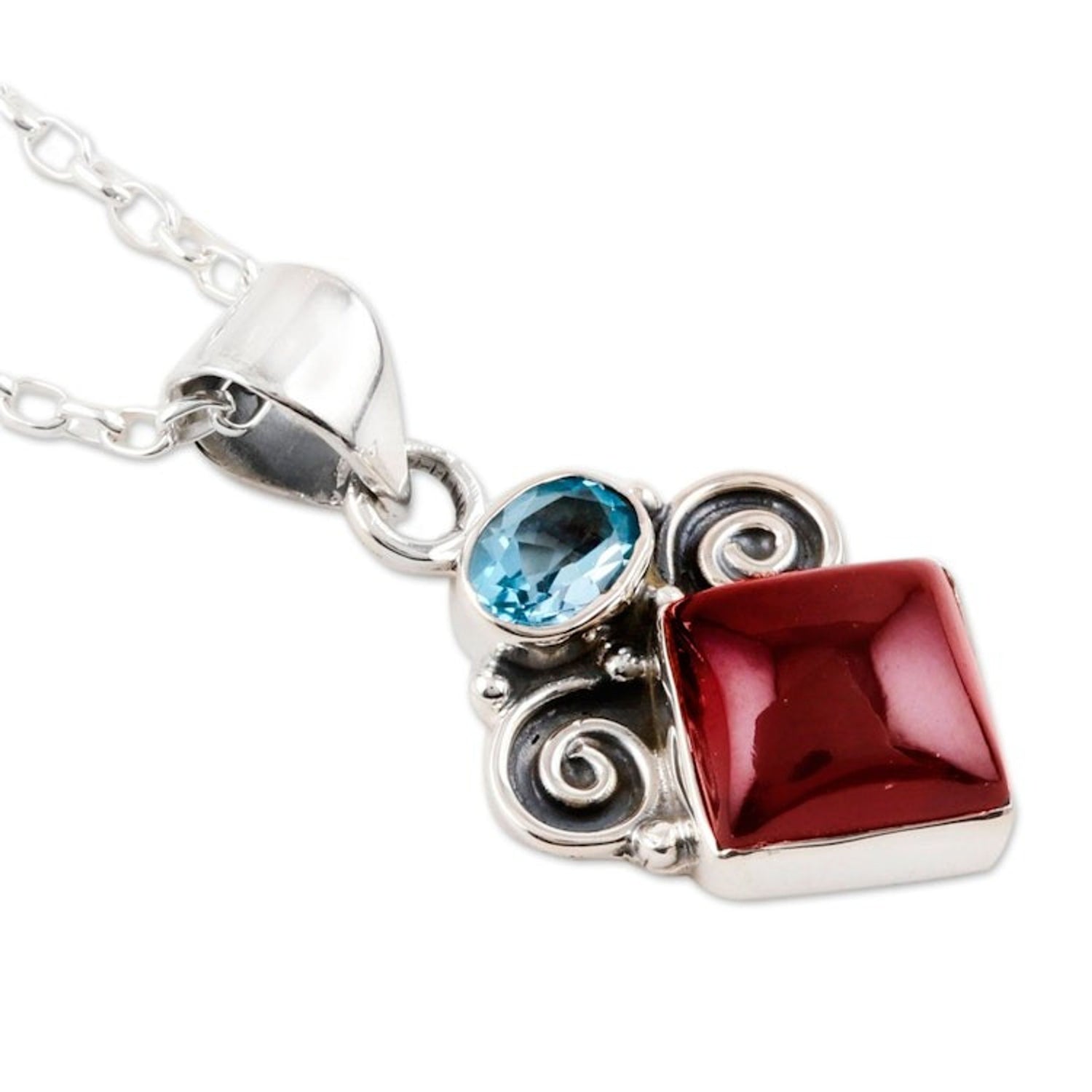 This Artisan Crafted Garnet and Blue Topaz Pendant Necklace by Independent Artisans, titled 'Rainbow Fragments,' is a pretty design from Indian artisan Shanker. The necklace features garnet cabochons and faceted blue topaz set in sterling silver, capturing two colors of the spectrum in a harmonious arrangement. Oxidized accents add depth to the design. The pendant hangs from a sterling silver cable chain, making it a stylish and versatile accessory. This piece represents perseverance, tradition, and the passion for craftsmanship, and is sure to be appreciated by collectors around the world.
