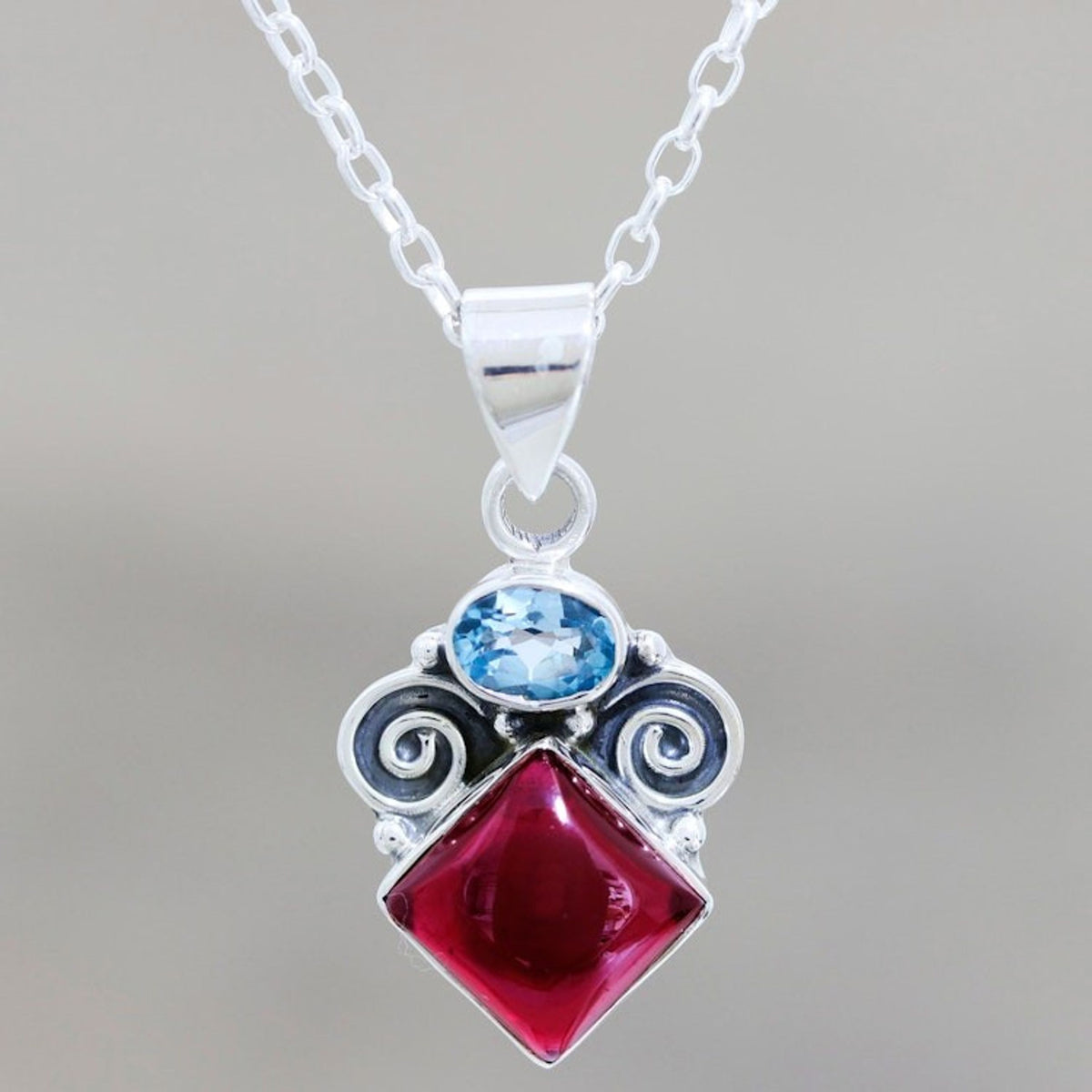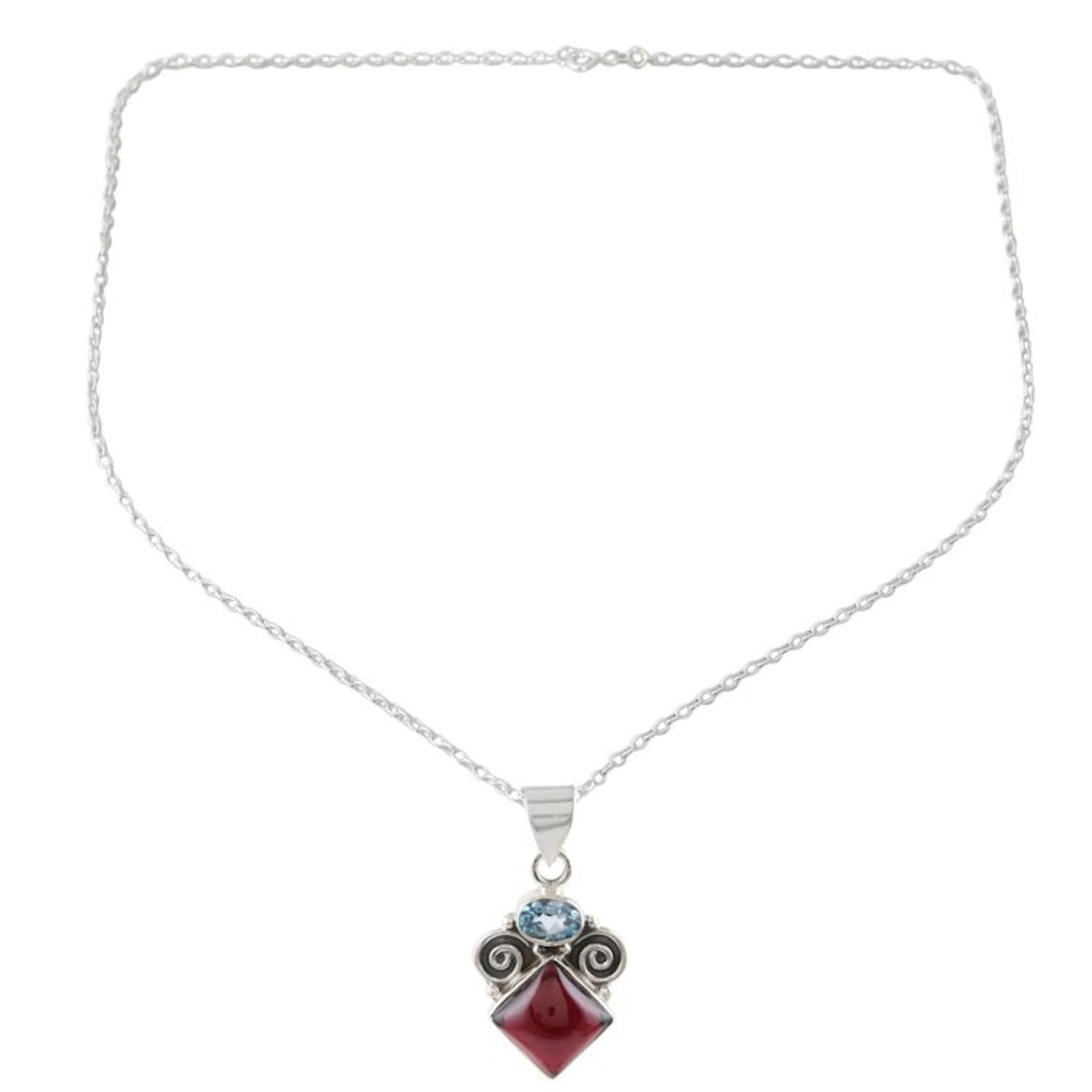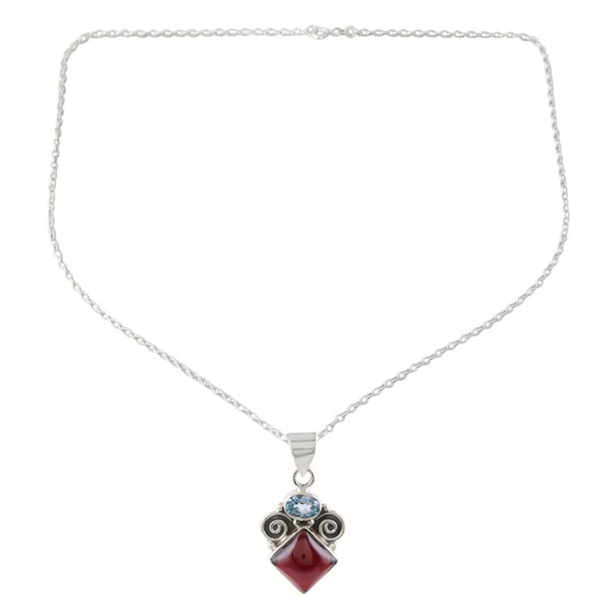 Crafted in India from .925 sterling silver, garnet, and blue topaz, this necklace features a cable chain with a spring ring clasp, measuring 18 inches L with a 1.3-inch L x 0.7-inch W pendant.