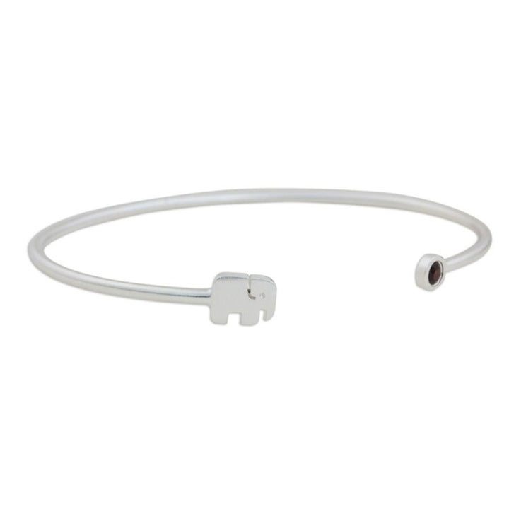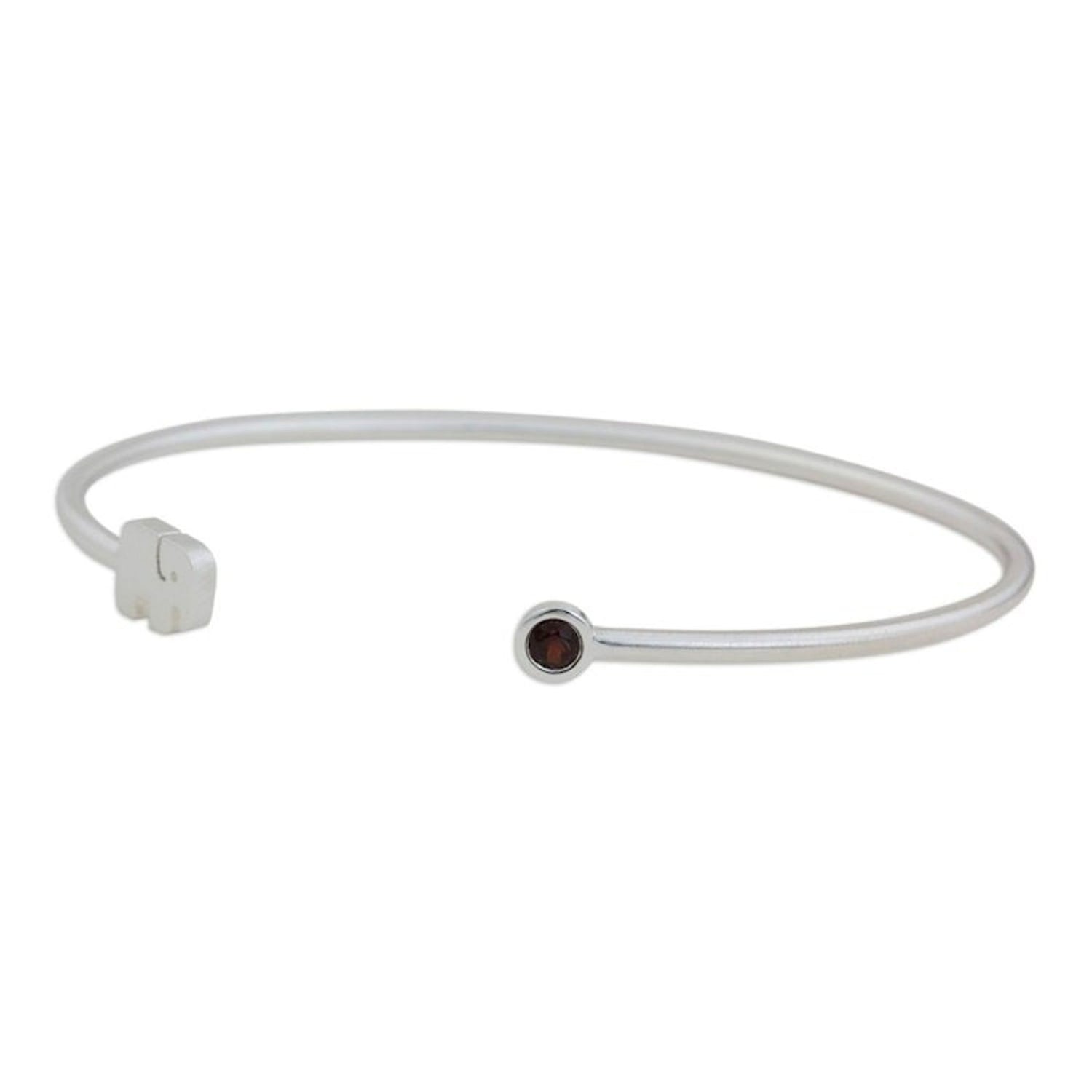 This Artisan Crafted Garnet and Sterling Silver Cuff Bracelet by Independent Artisans, titled 'Elephant Smile,' is a playful and meticulously handcrafted piece from Thai artisan Jantana. The cuff bracelet is made of sterling silver with a brushed-satin finish, which gives it a soft and modern glow. The open-ended design features a tiny, charming elephant on one end and a round gemstone of natural garnet on the other, creating a delightful and whimsical balance. This bracelet is a beautiful example of the artisan's ability to create pieces that balance delicacy and modern appeal.