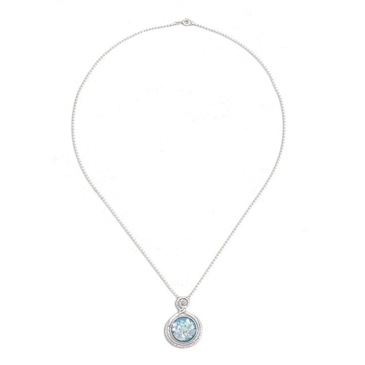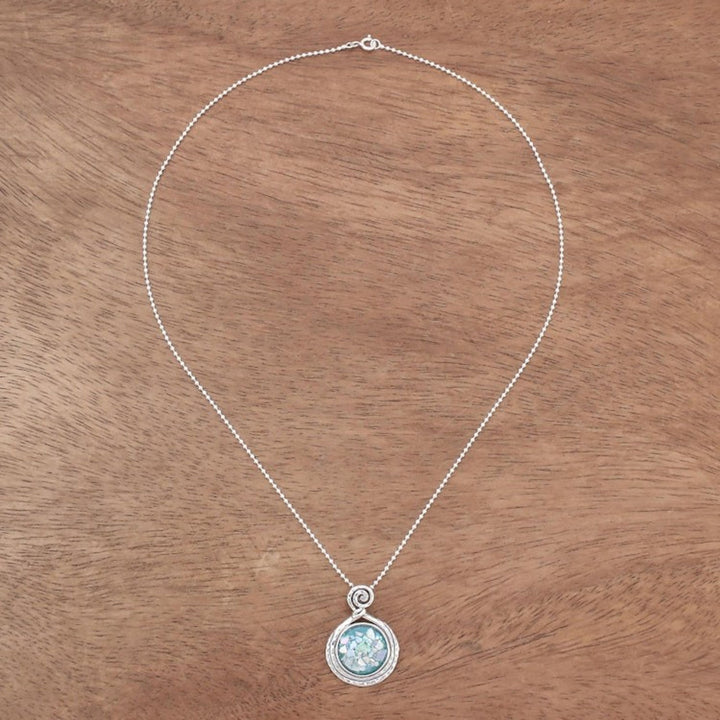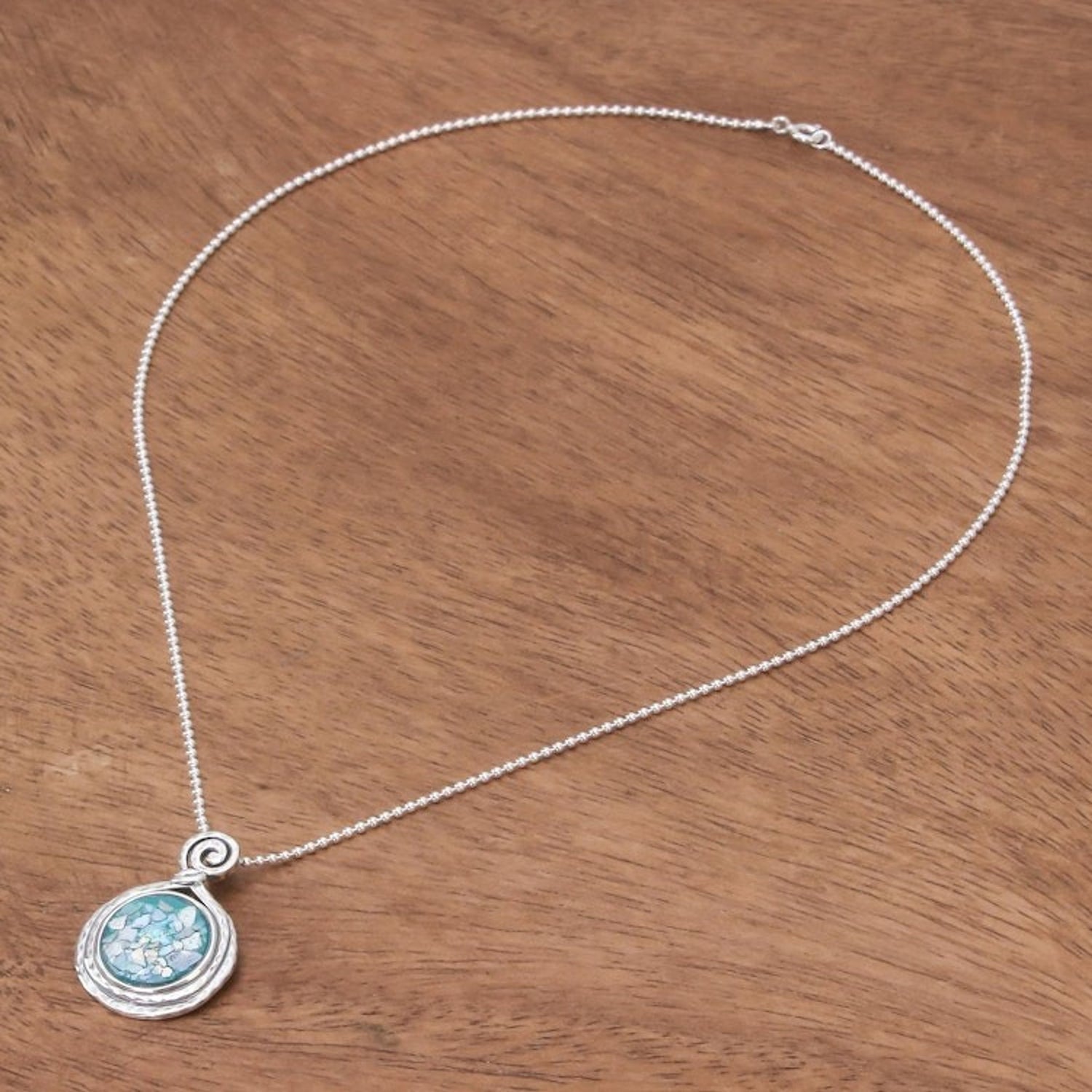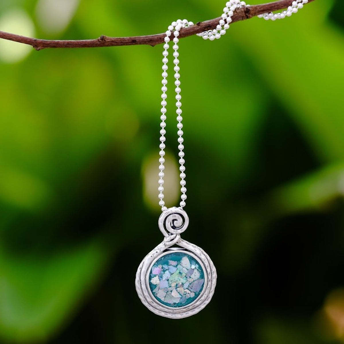 This Artisan Crafted Roman Glass Pendant Necklace by Independent Artisans, titled 'Glittering Moon,' is a beautiful and historical design from Thai artisan Michael Krainer. The pendant features a piece of ancient Roman glass that glitters in the light and resembles the moon. The glass is set in sterling silver, which creates a swirl pattern. This piece is a beautiful blend of tradition and innovation, crafted with care and infused with love.