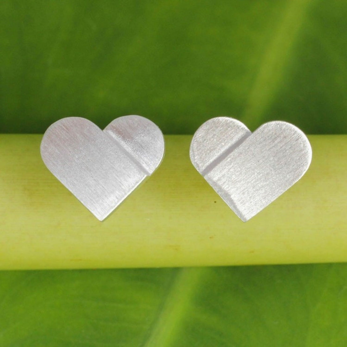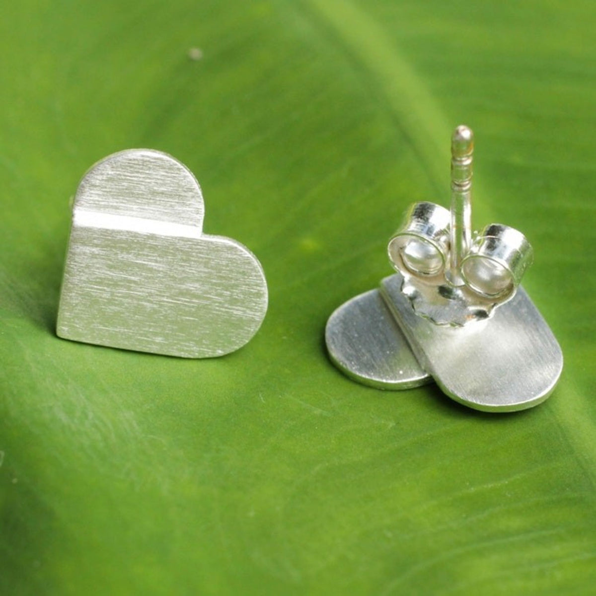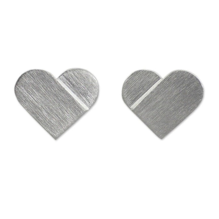 These Artisan Crafted Silver Heart Earrings with Brushed Finish by Independent Artisans, titled 'Full Heart,' are an original and contemporary design from Thai artisan Jantana. The sterling silver button earrings feature partial hearts that become complete, with their missing other halves joining from behind. The design is rendered in the artisan's trademark brushed-satin finish, adding a modern and unique touch. These earrings are a beautiful reflection of the artisan's personal style and her commitment to community.
