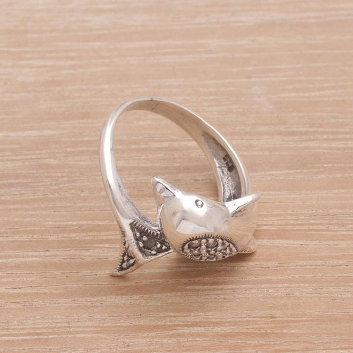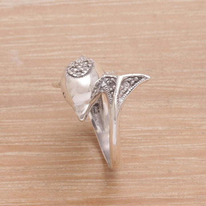 This Artisan Crafted Sterling Silver Dolphin Cocktail Ring by Independent Artisans, titled 'Soaring Dolphin,' is a majestic and nature-inspired design from Balinese artist Yuniati. The ring's band is a simply designed, smaller band for comfort. The top features a shining silver dolphin that soars above the water, with silver accents to create a glimmering effect. This piece reflects the artist's dedication and creative passion, blending natural beauty with Balinese heritage.