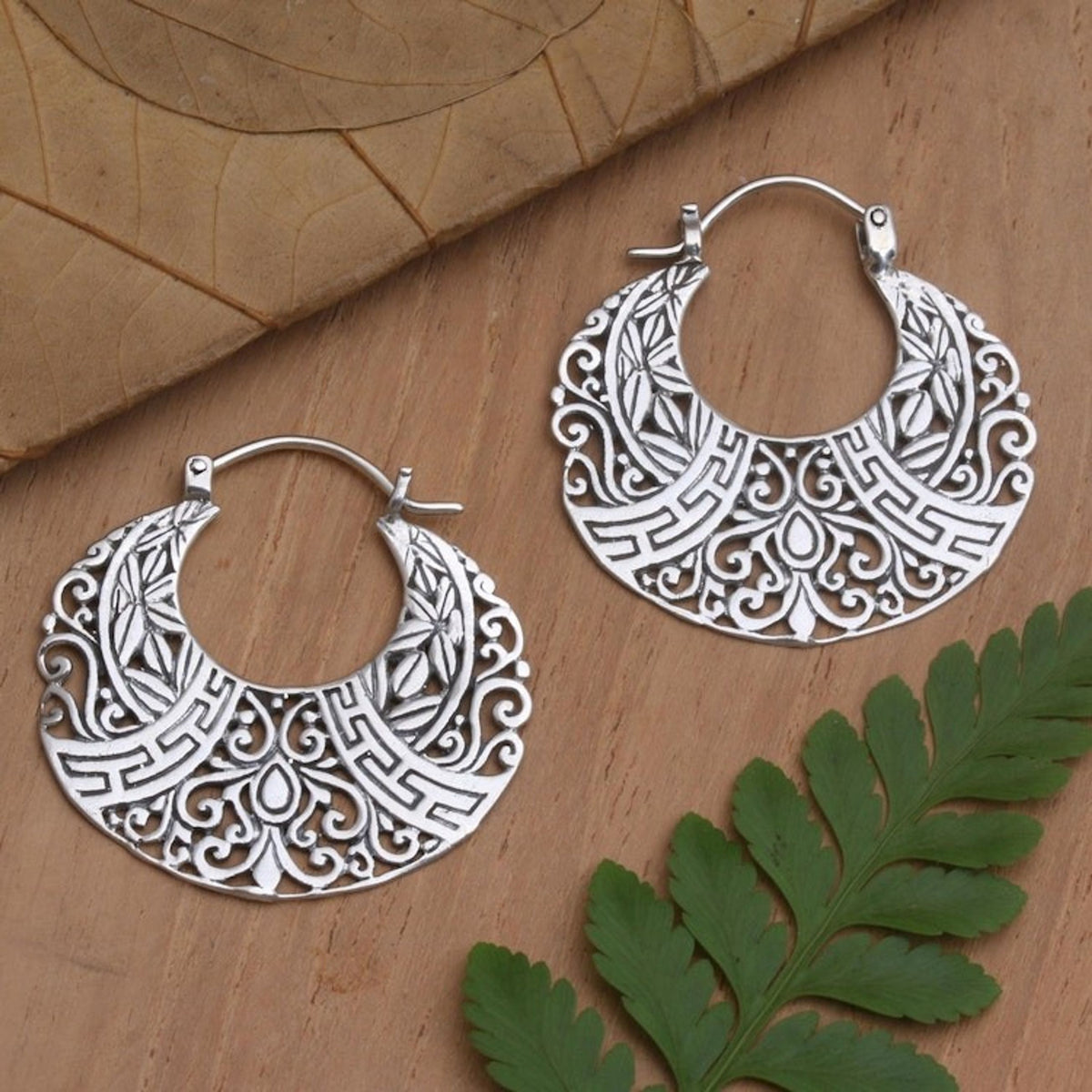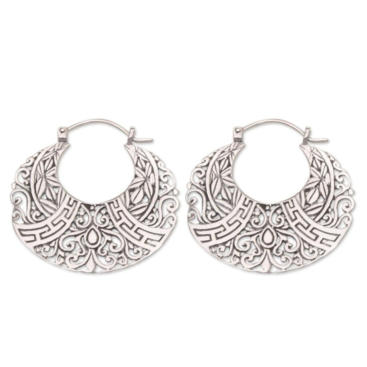 These Artisan Crafted Sterling Silver Hoop Earrings by Independent Artisans, titled 'Lonesome Moon,' are an elegant and contemporary design from Balinese artisan I Gede Putra Adi. The earrings combine geometric designs with organic swirls and curls, and are handcrafted from sterling silver. The openwork designs shine in a combination finish. This piece is a bridge between the past and present, sustaining the community's craft in an era of change.