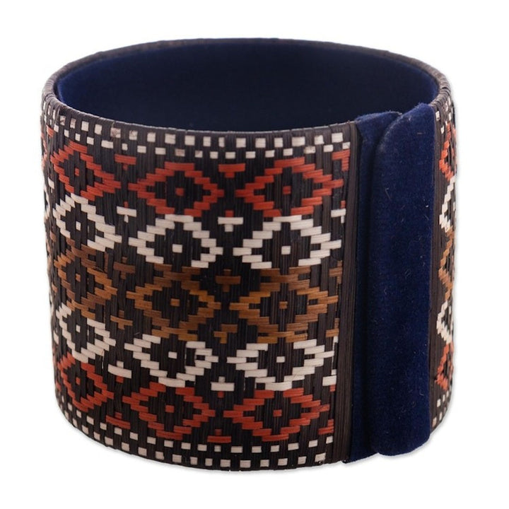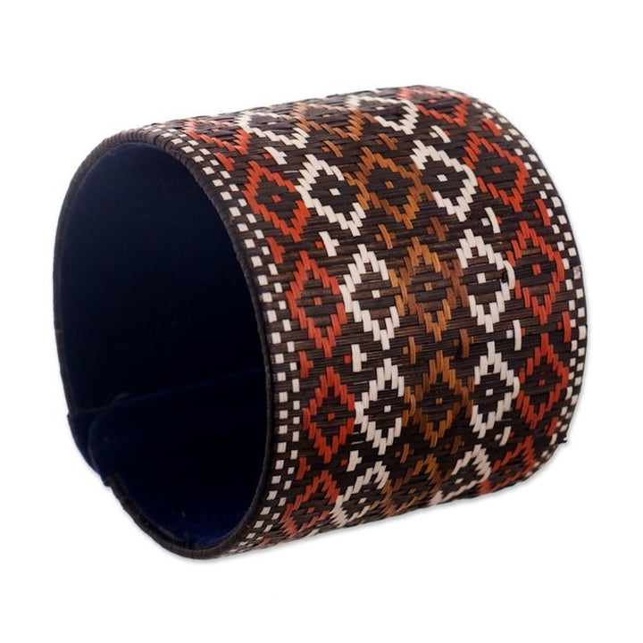 This Artisan Crafted Wide Cuff Bracelet by Independent Artisans, titled 'Dance of Gratitude,' is a bold and culturally significant piece from the Zenú Community in northwest Colombia. The wide cuff is covered with handwoven caña flecha fiber in brown, orange, and white. This neotropical grass is integral to the Zenú culture, and the intricate geometric pintas carry symbolic meaning, honoring the land and ancestral narratives.