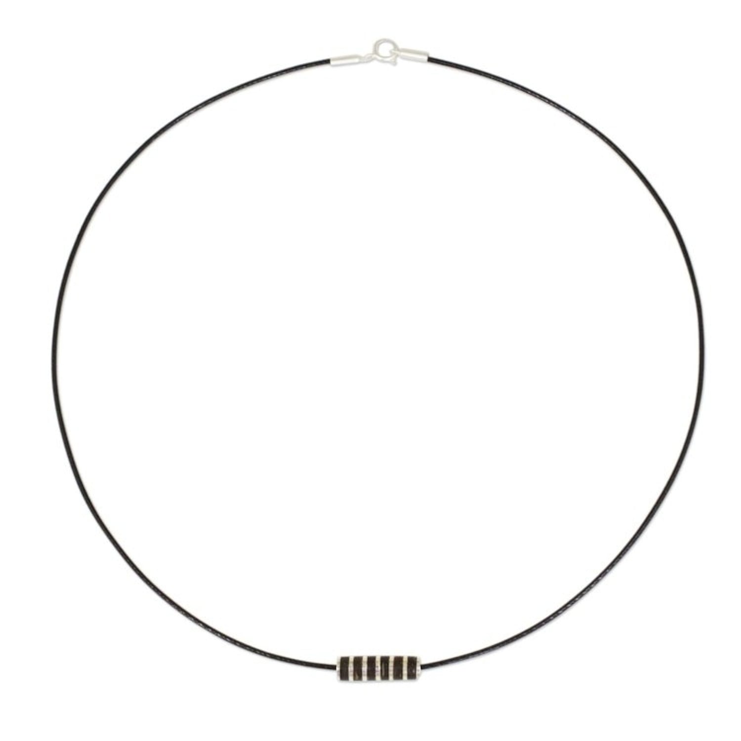 This Artisan Crafted Wood and Sterling Silver Pendant Necklace by Independent Artisans, titled 'Barrel Roll,' is a natural and refined design from Thai designer Sarote Lochotinunt. The pendant is crafted from dark brown Indian elm wood and sterling silver with a matte finish. The pendant centers a black nylon cord with a sterling silver clasp. This piece reflects the artisan's technical expertise and his love for natural materials, creating a design that is both strong and artistic.