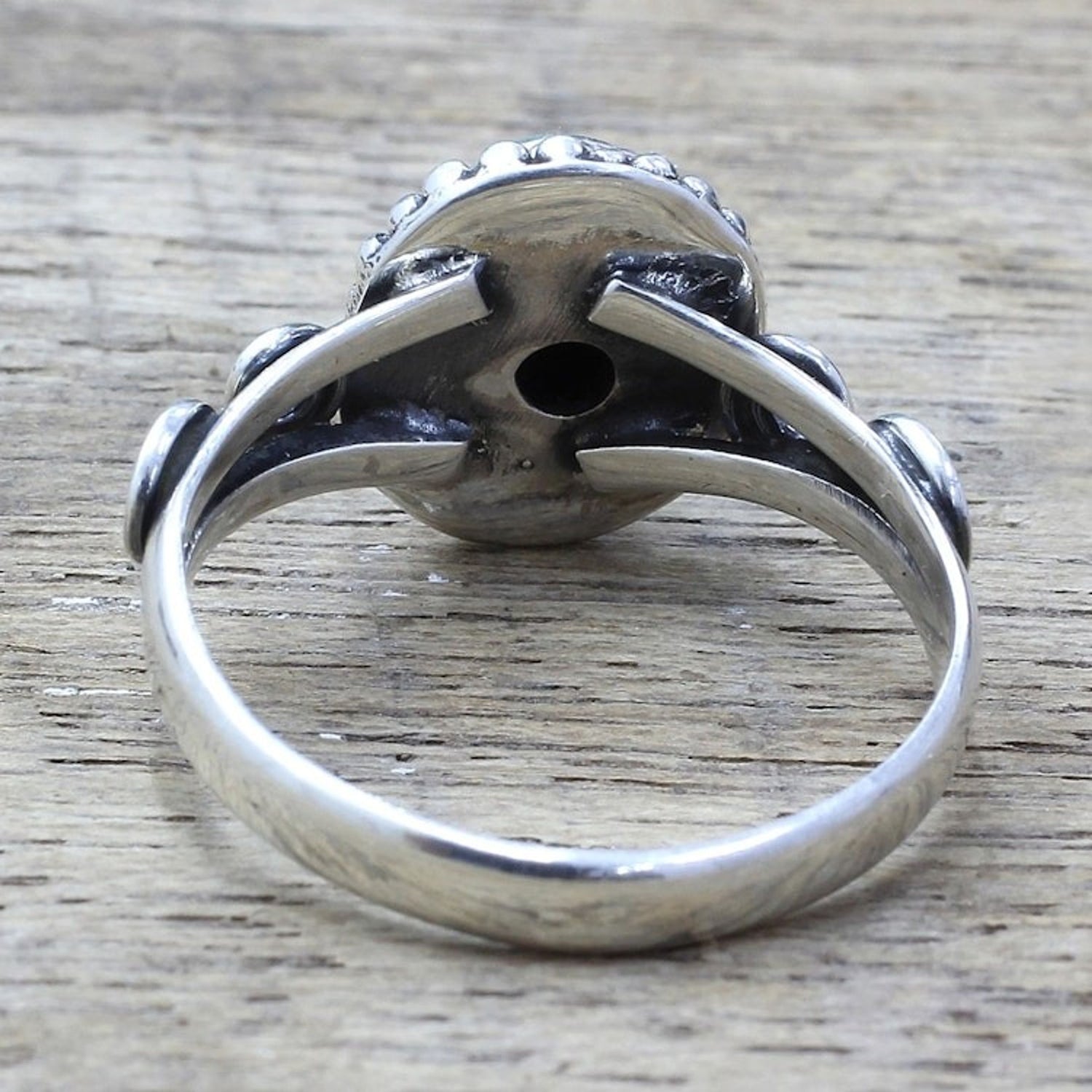 Crafted in India from .925 sterling silver and natural malachite with a combination finish, the ring has a band width of 3 mm and a crown/bezel measuring 0.5 inches L x 0.4 inches W.