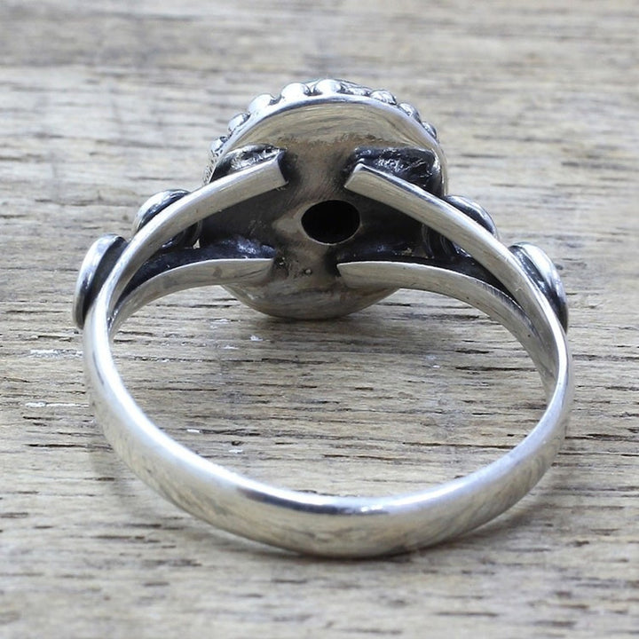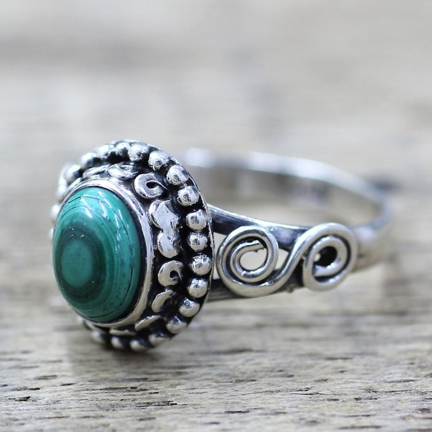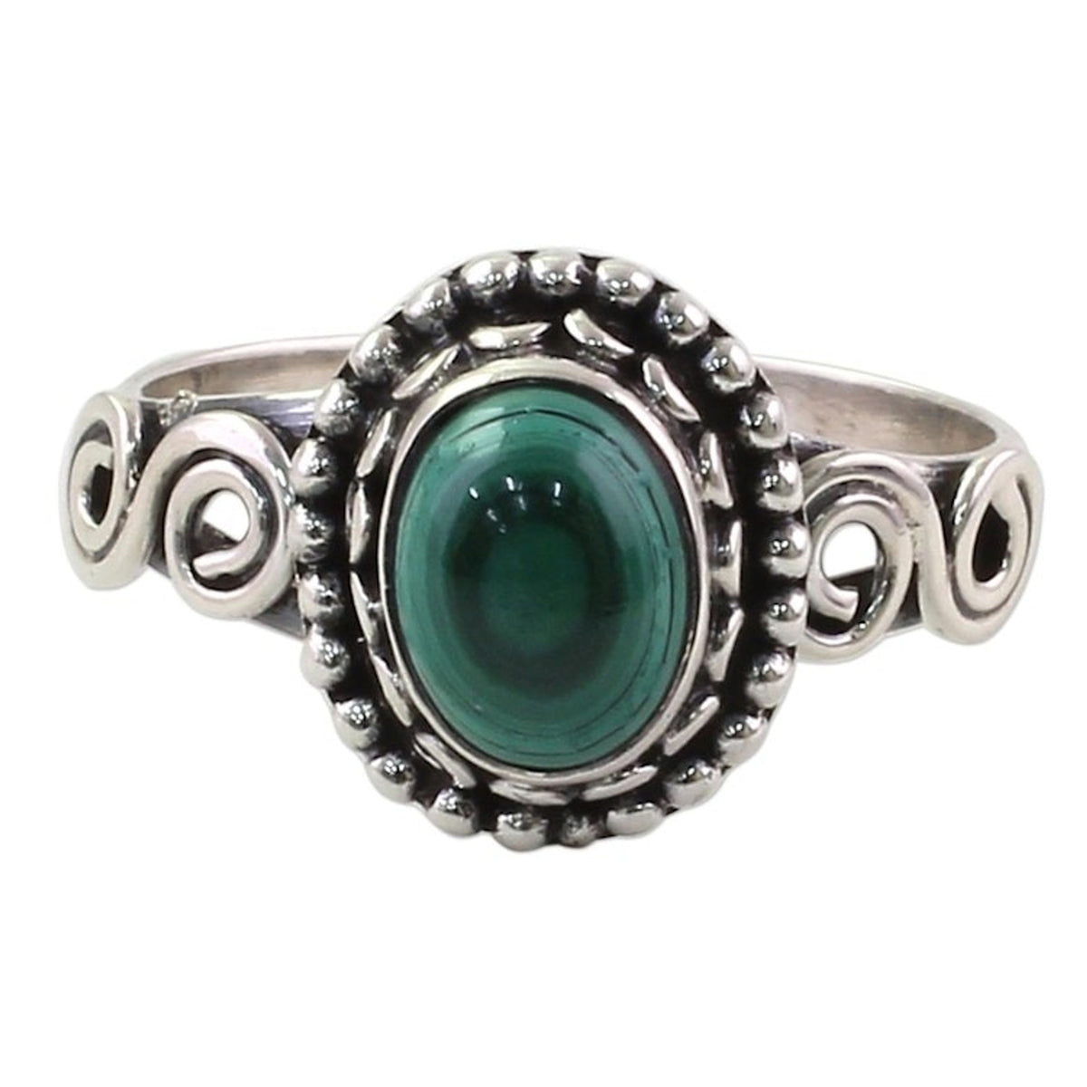 This Artisan Designed Sterling Silver and Malachite Cocktail Ring by Independent Artisans, titled 'Hypnotic Forest,' is an exquisite and nature-inspired design from Indian artisan Aparna. The cocktail ring is crafted from sterling silver and features a verdant malachite stone surrounded by silver beads. The band is adorned with elegant spirals, making this an ideal accessory for any occasion. This piece reflects the artisan's shared dream with her husband and their commitment to carrying forward their family's creative spirit.