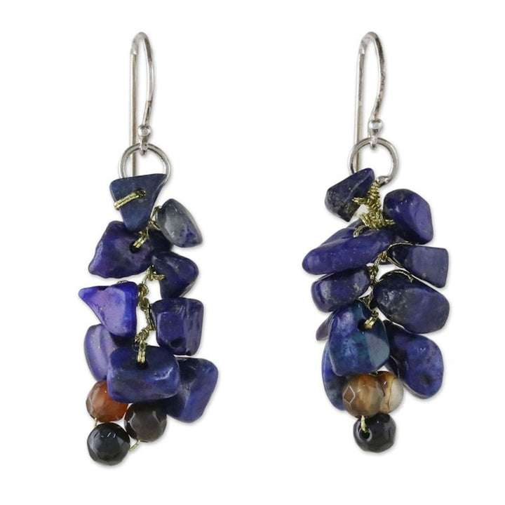 These earrings are crafted from 925 sterling silver, lapis lazuli, and dyed agate. They feature a matte finish and are equipped with hook earrings, measuring 1.8 inches long by 0.5 inches wide.