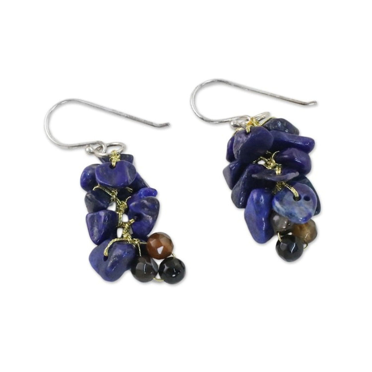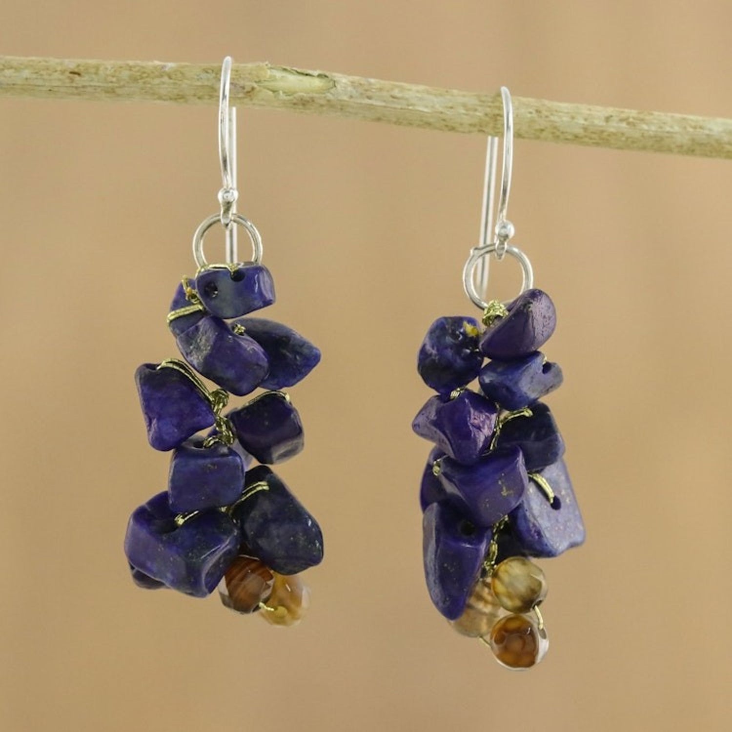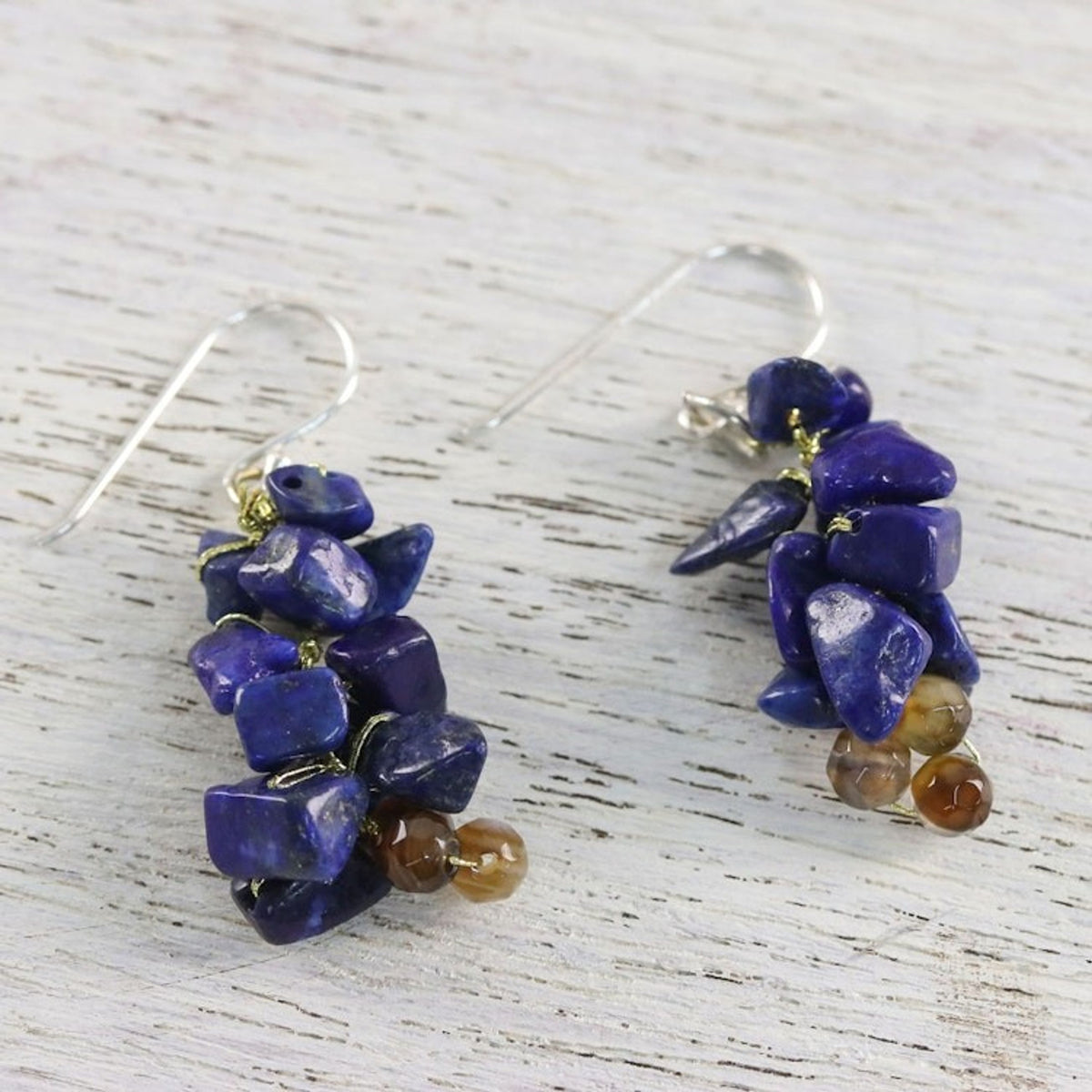 These 'Afternoon Blue' by Independent Artisans are an enchanting and delicate pair of earrings that celebrate the artistry of nature and color. Hand-knotted by a Thai designer on silken cords, the gossamer web gracefully holds mesmerizing lapis lazuli and dyed agate gemstones. Each earring is a testament to the preservation of traditional handcrafting techniques in a modern world, creating a piece that is more than just an adornment—it's a celebration of skill and heritage.