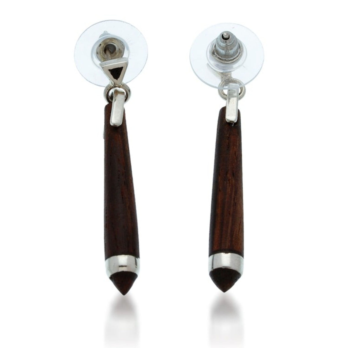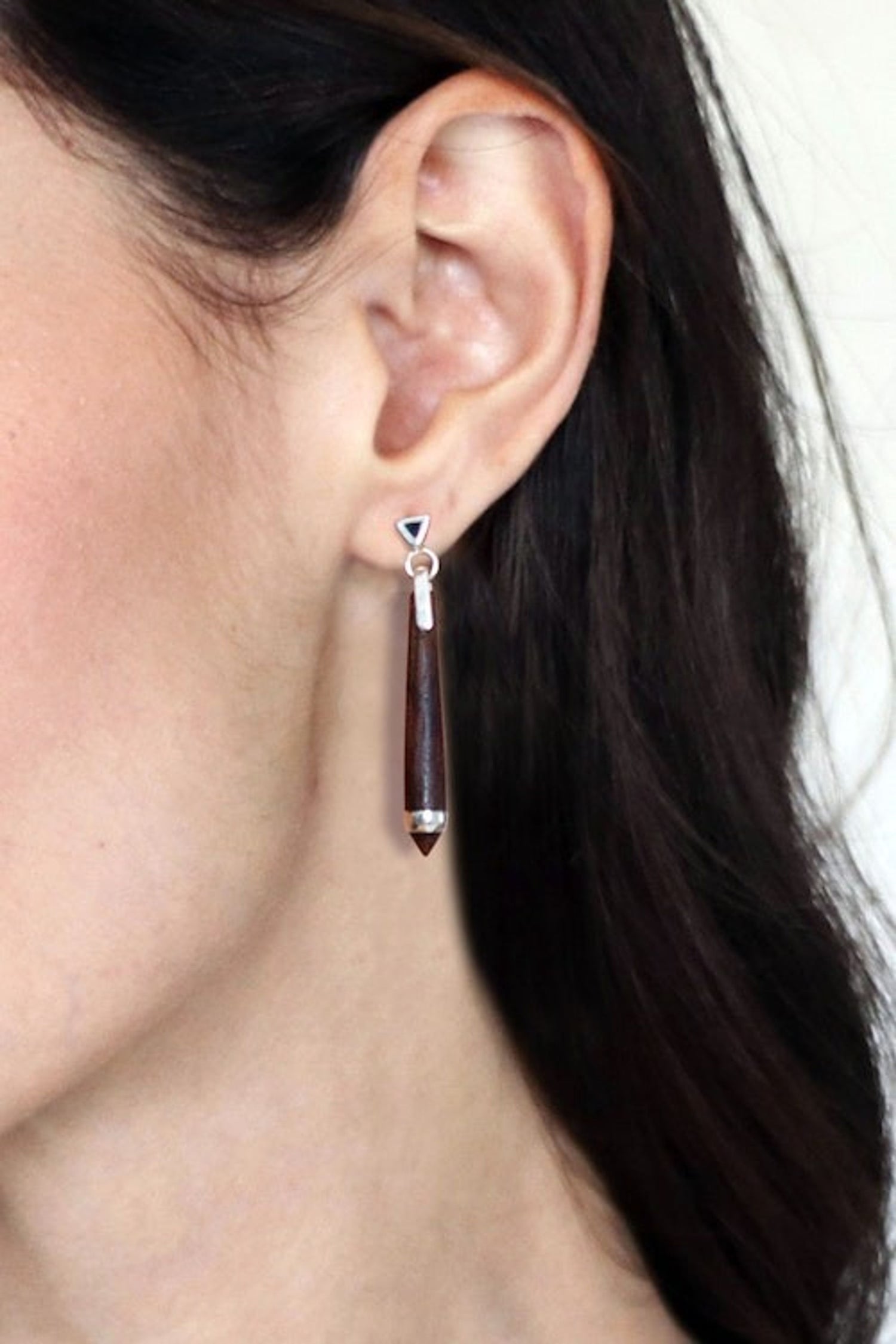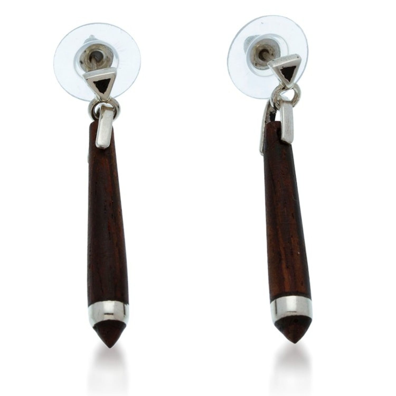 These earrings are handcrafted from bocote wood and 925 sterling silver with a high-polish finish. They feature post earrings and measure 1.6 inches long by 0.2 inches wide.