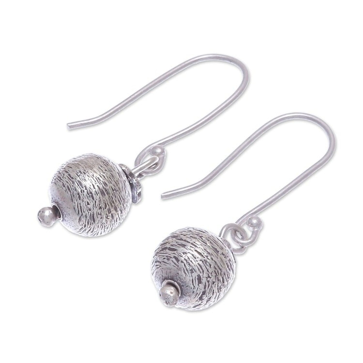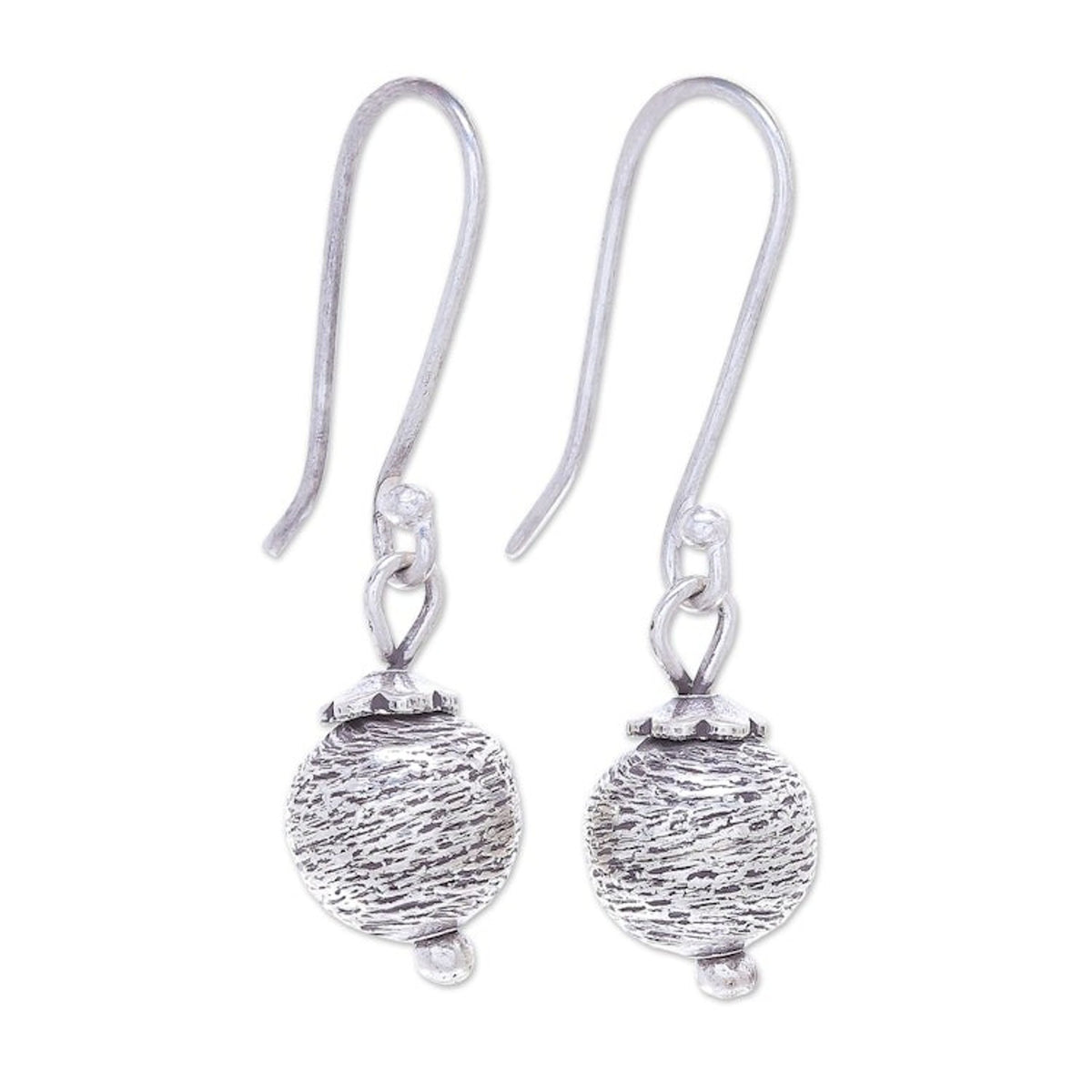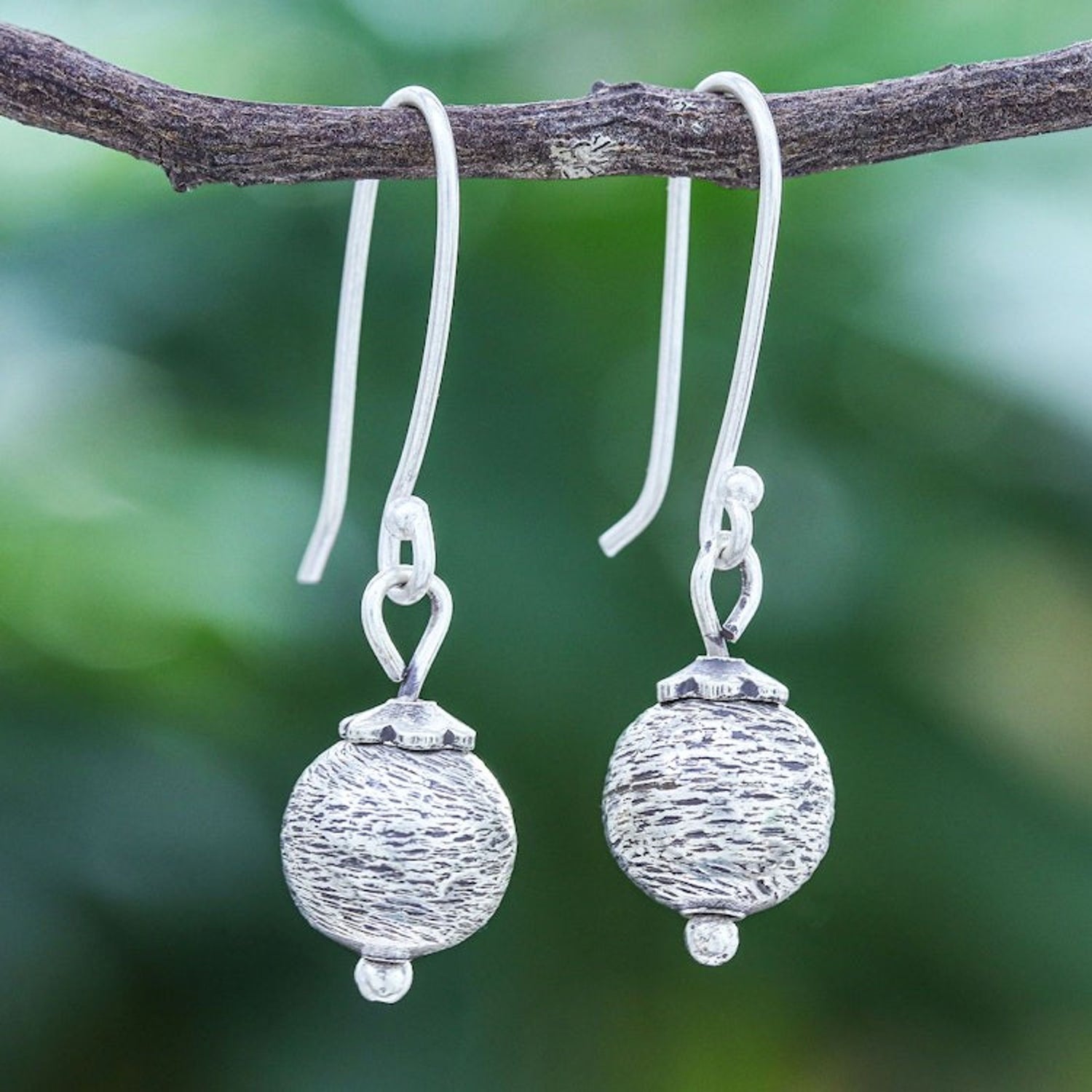 These 'Future Earth' by Independent Artisans are a pair of pretty dangle earrings that capture the harmony of nature and art. Designed by Thai artisan Samart Takham, these earrings feature textured globes of oxidized sterling silver that beautifully catch the light. The globes are topped with petite sterling silver flower charms, adding a delicate touch of floral charm. This piece carries the spirit of Thai heritage and family artistry.