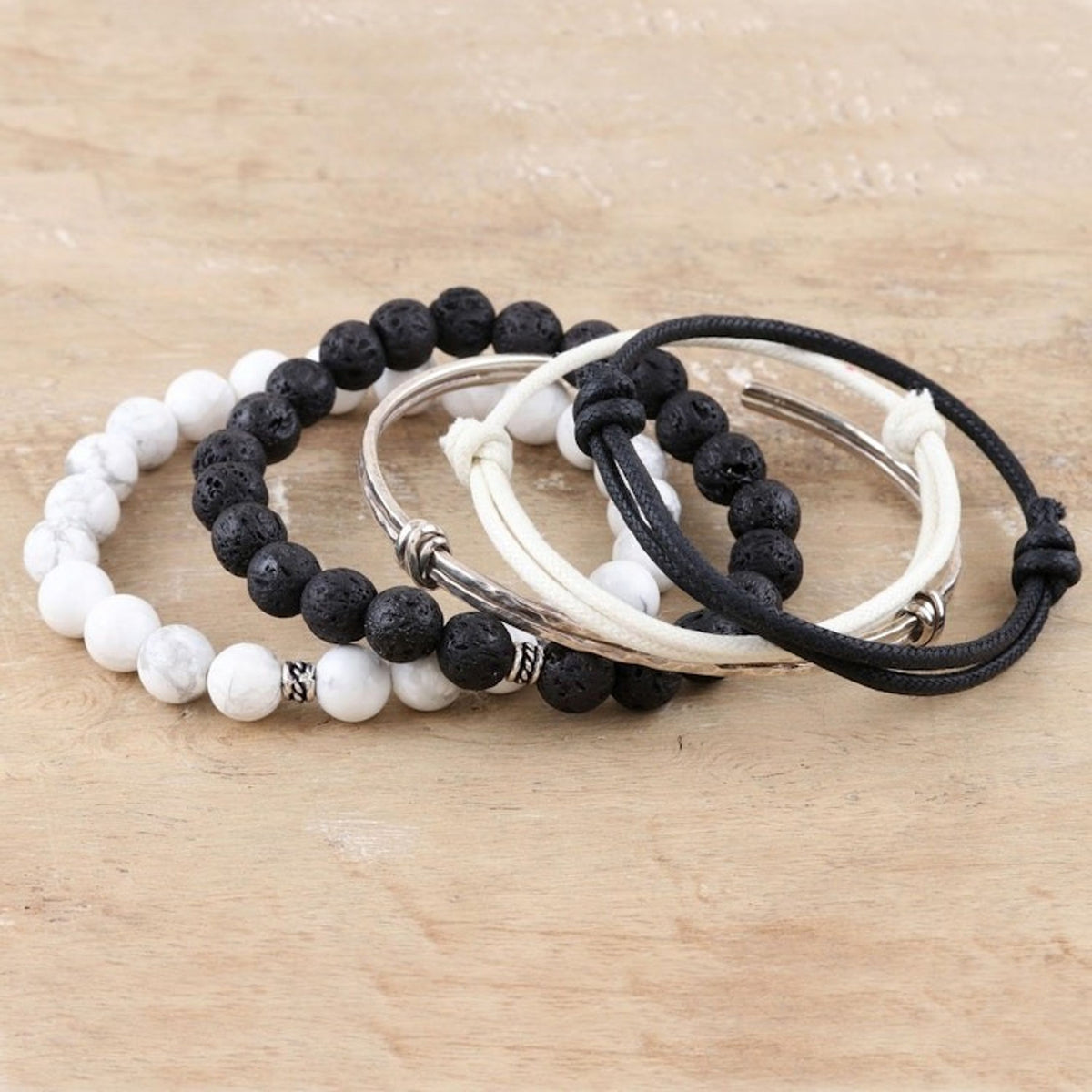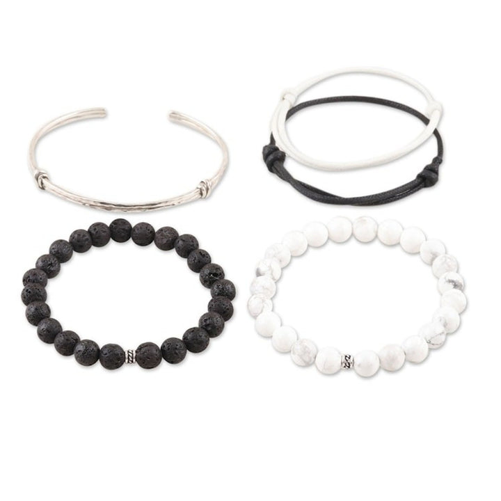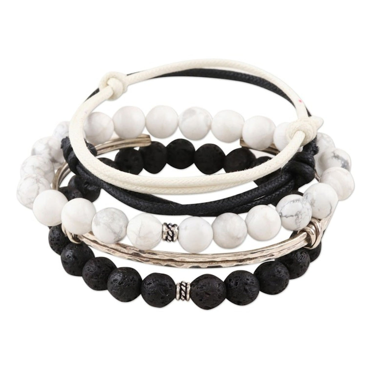 This bracelet set is made from 925 sterling silver, howlite, lava stone, waxed cotton cord, and elastic cord. It features a hammered finish. The end-to-end length of one bracelet is 2.4 inches, another measures 6.3 inches in inner circumference, and the third measures between 7 and 10.3 inches in length.