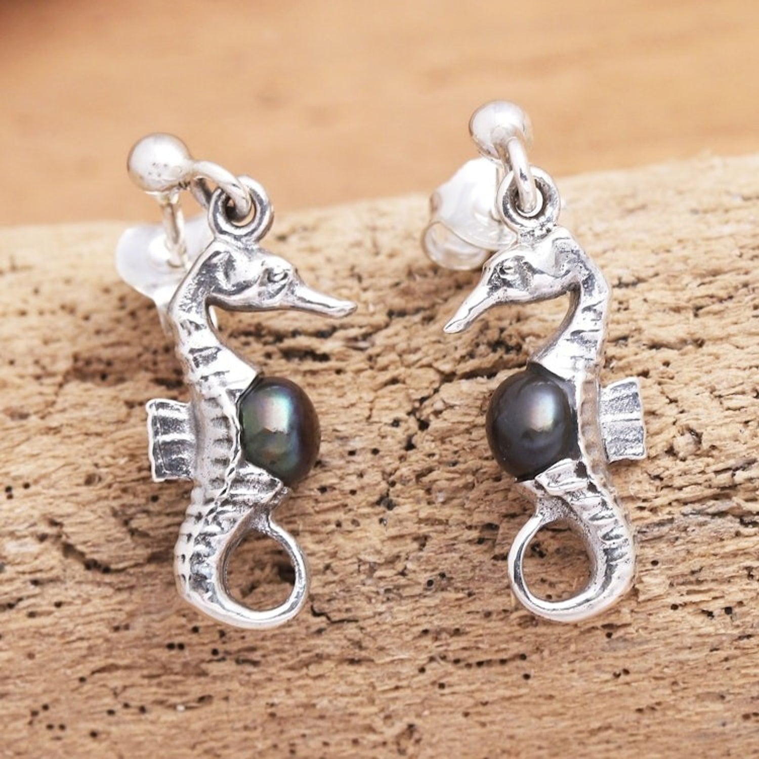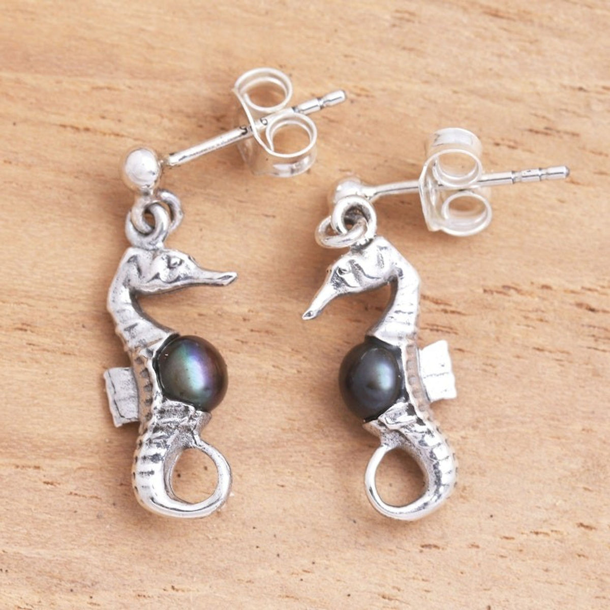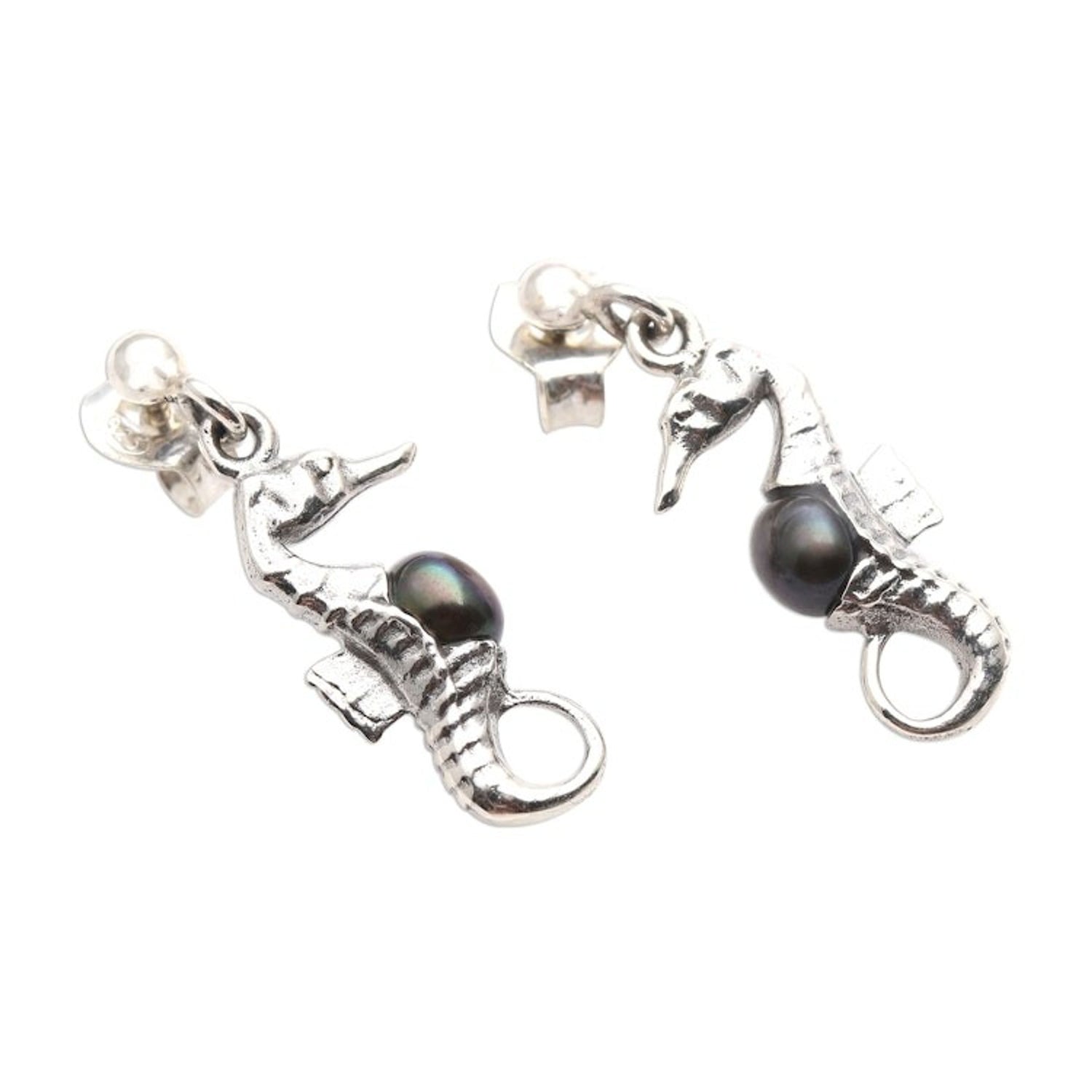 Bali Sterling Silver Seahorse Earrings with Dark Pearls 'Amed Night Seahorse'